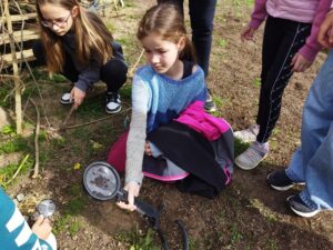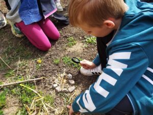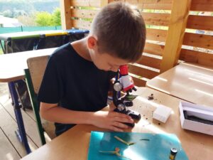 V pátek jsme se společně rozhodli pro badatelskou hodinu venku. Děti si donesly lupy a mikroskopy a šlo se.