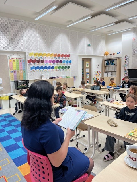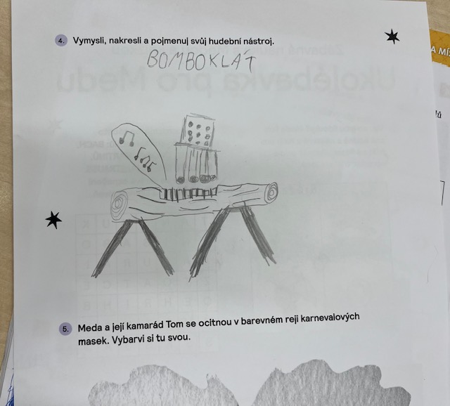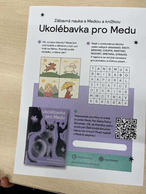 Navštívila nás paní spisovatelka Eva Vychodilová a představila nám svou novou knihu, která se jmenuje Ukolébavka pro Medu. Slyšeli jsme ukázky z knihy, poslechli jsme si písničky, protože součástí knihy je playlist, který se dá načíst pomocí QR kódu a jsou na něm nejen ukolébavky. 🙂 Vypracovali jsme si pracovní list ke knize a vymýšleli své fantazijní hudební nástroje. Pokud se chcete dozvědět více o tomto krásném příběhu, je možné si knihu zakoupit. 🙂