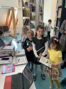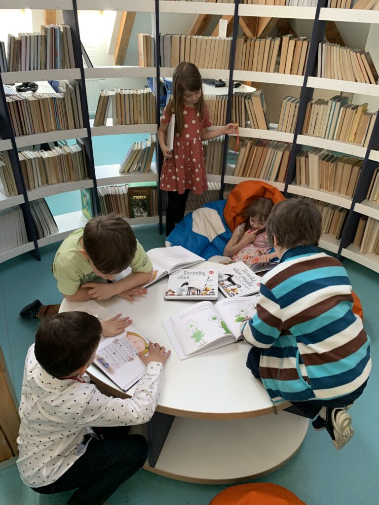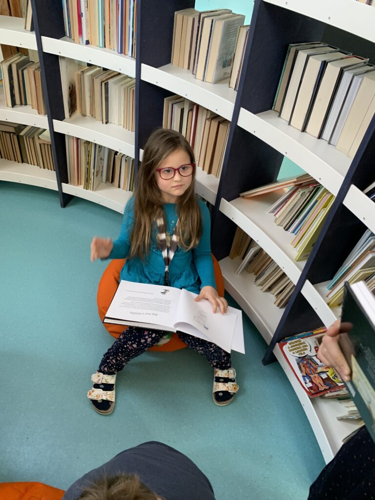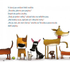 Celá třída jsme se vypravili do knihovny pro knížky na společné čtení. Paní knihovnice pro nás měla připravenou úplně novou knížku Terezka chce pejska. Knížka je zajímavá tím, že slabiky ve slovech jsou barevně odlišené, což dětem usnadňuje čtení. A že je knížka zajímavá, bylo vidět hned. Děti ji otevřely, posedaly si v knihovně na pytle a ke stolečkům a hned začaly číst. Nikdo nechtěl čekat se čtením až do třídy.