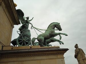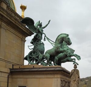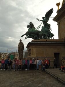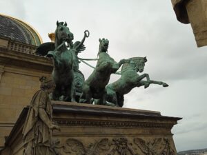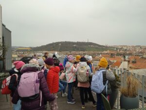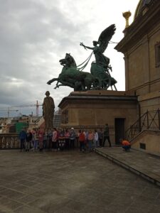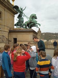 Střechu Národního divadla zdobí koňská spřežení, prohlíželi jsme si je z mostu. A to jsme netušili, že se k nim dnes podíváme. Bylo to plno schodů. Na terase jsme si prohlédli mohutné sochy trojspřeží – trigy, které řídí okřídlená bohyně vítězství Niké (latinsky Viktoria). Přestože bylo podmračené počasí, výhled jsme odsud měli velmi hezký.