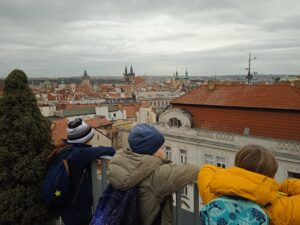 Vlastně nevydali. Evička pro nás měla překvapení. Její tatínek, který pracuje nad nakladatelstvím Albatros, nás pozval, abychom se podívali na zajímavý výhled z terasy. Rádi jsme nabídku využili. Bylo hezké vidět zas jiný pohled, střechy, kupole, věže, štíty. Přemýšleli jsme, jaké by bylo, to malovat. Z terasy nás vyhnal drobný déšť. Děkujeme.