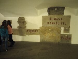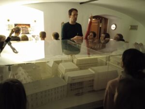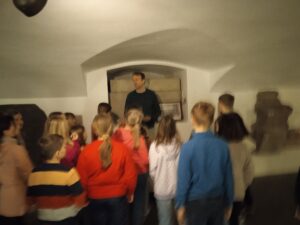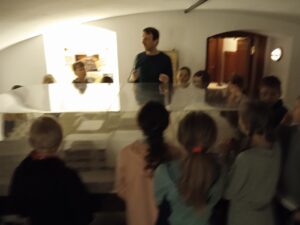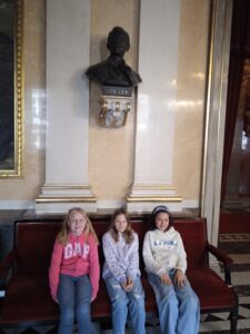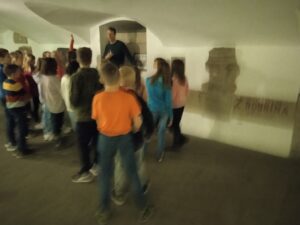 Pak jsme sestoupili do podzemí, kde jsou základní kameny. Děti překvapilo, z jak dalekých míst sem doputovaly. Před závěrečnou částí exkurze jsme poseděli ve foyer a náš průvodce nám popovídal i jeho funkci i krásné výzdobě včetně bust.