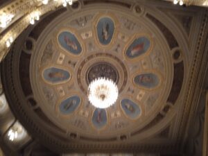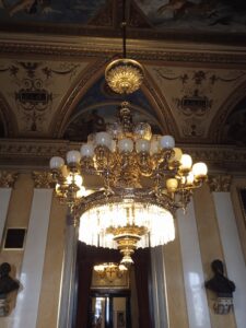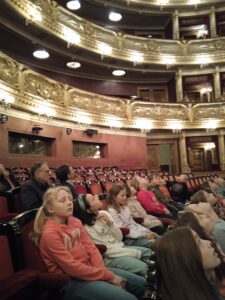 V Národním divadle jsme si prohlédli hlediště, krásné reliefy a výzdobu na zdech, stropě i stěnách. Děti přiřazovaly umění k alegoriím múz na stropě. Doufali jsme, že nádherný ohromný lustr s 207 žárovkami je pevně připevněn. Obdivovali jsme nádhernou Hynaisovu oponu i pátrali, kde mají vyhrazená místa vzácné návštěvy jako pan prezident nebo pan primátor.