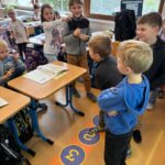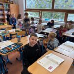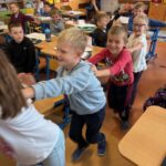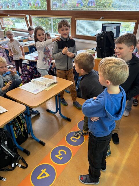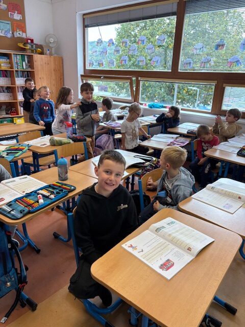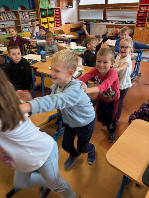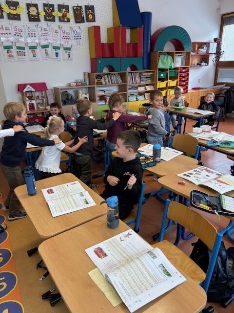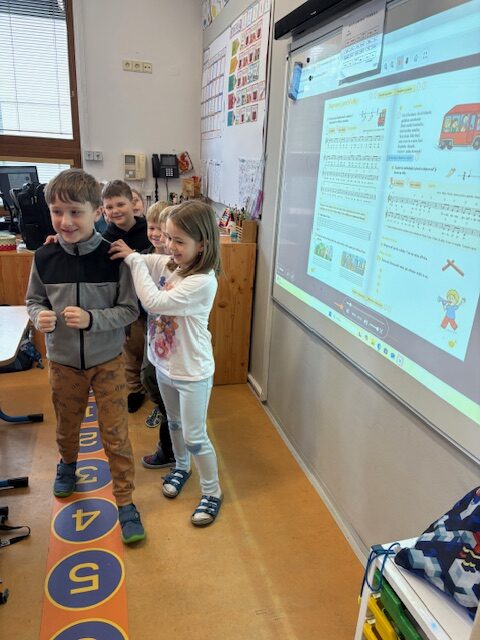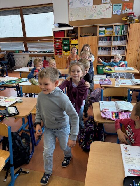 ve Vaší třídě vyučuji hudební výchovu a ráda bych Vám prostřednictvím několika fotografií přiblížila, jak naše výuka probíhá. Mým cílem je, aby děti zpívaly rády, a aby se na hodiny hudební výchovy těšily. Na fotografiích můžete vidět, jak si děti hrají na auto, které veze členy širší rodiny. Uličky mezi lavicemi se proměnily v silnici a ručky sedících dětí v závory na přejezdech. Písnička Auto je rytmicky jednoduchá a díky pohybové aktivitě pro děti zábavná. Od začátku školního roku jsme se také naučili písničky Pod naším okýnkem a Adámku náš.