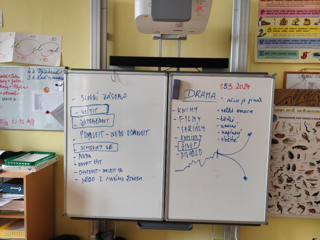 Paní Alice Nellis si udělala čas a přišla mezi nás. Někteří si pamatují minulé povídání na téma Jak se píše příběh? Dnes jsme společně charakterizovali drama. Co je to drama? Něco je jinak, než jsme zvyklí, je to velká reakce a množství různých emocí. Kdy drama nastává? Před soutěží, před závodem, před testem, rybáři, když mají na udici rybu. Co se děje v našem těle? A pozná naše tělo, že se něco děje? Máme rádi napětí? A s tím vším souvisí i čtení knih. Proč je čteme? Vciťujeme se do literárních hrdinů, chceme prožívat jejich příběhy. Knihy a příběhy nám pomáhají. Povídali jsme si i o knihách, které nyní čteme v dílně čtení. K některým otázkám se ještě vrátíme v třídnických hodinách. Umíme se vcítit do ostatních? Co asi prožívají? Umíme se vcítit do rodičů?