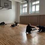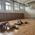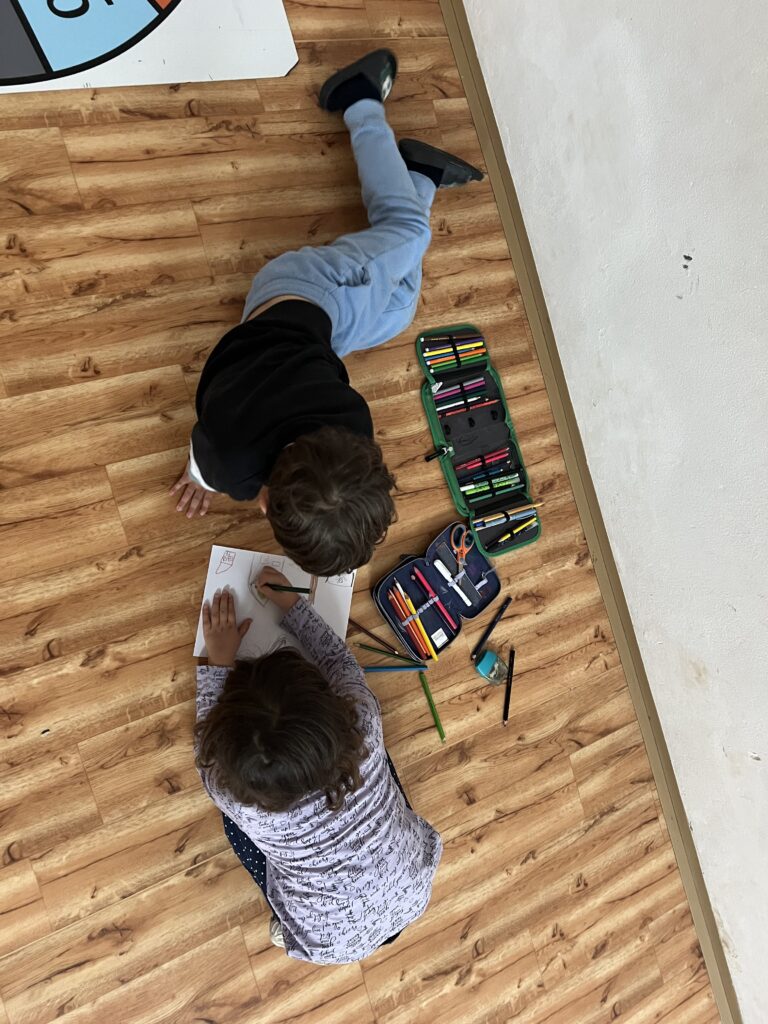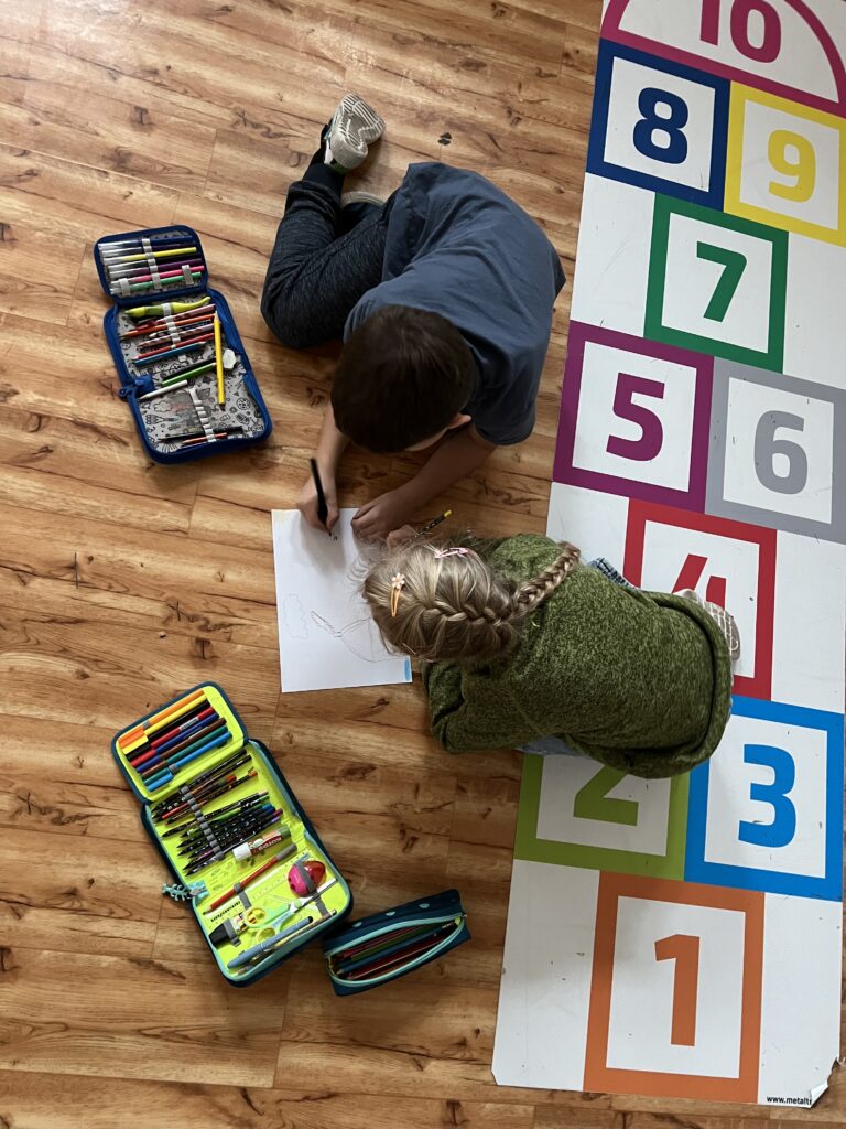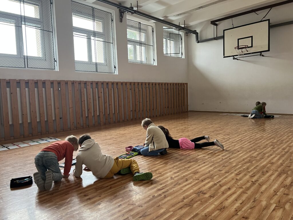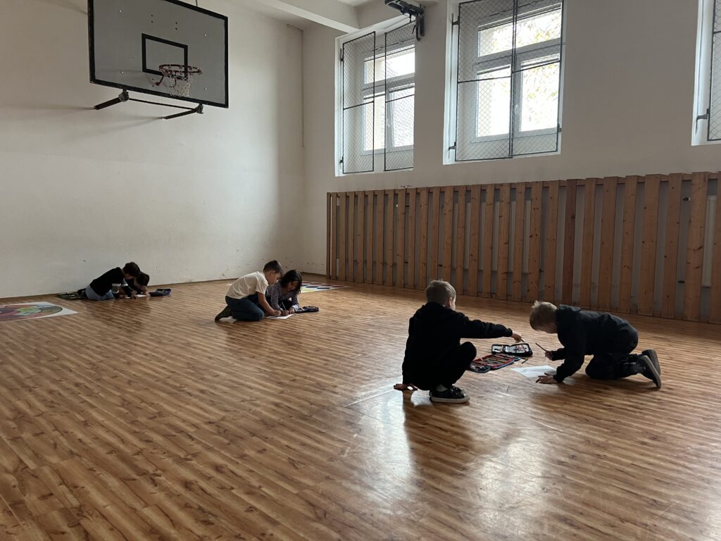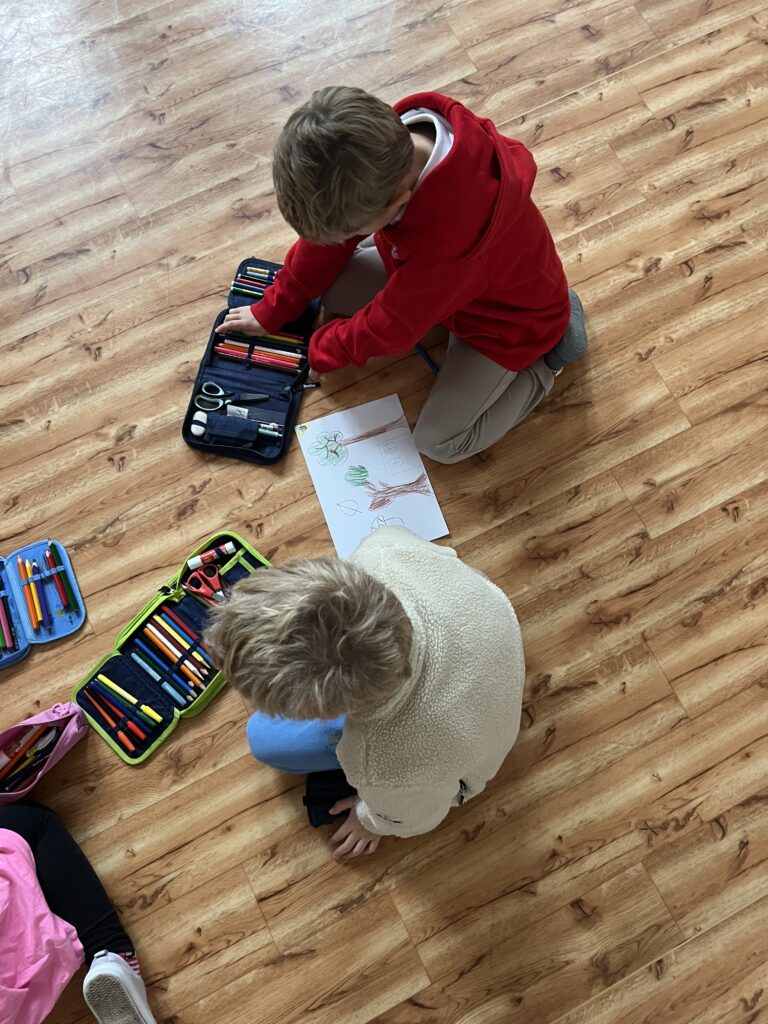 Každá dvojice začala kreslit podzimní obrázek, ale po chvíli se děti musely zvednout a přesunout k jinému papíru – a pokračovat v práci, kterou začal někdo jiný. Takto se obrázky několikrát vystřídaly a každý z žáků přispěl k několika dílům.
