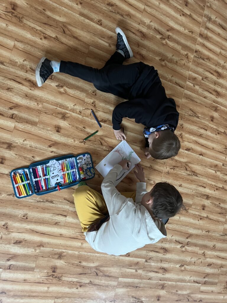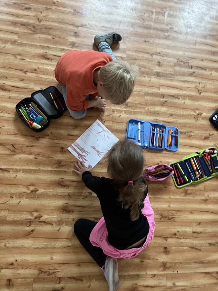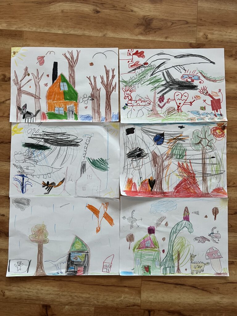 Bylo zajímavé pozorovat, jak se kresby postupně vyvíjely – někdo začal domečkem, další ho vybarvil, jiný přidal komín a kouř, další listí nebo podzimní stromy, dinosaury, lávu či různá zvířátka.
