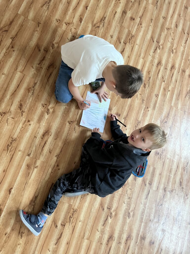 Na konci vzniklo šest krásných společných obrázků plných barev a nápadů. Každý jsme si ukázali a povídali si o tom, kdo se na jeho tvorbě podílel a co do něj přidal. Děti byly pyšné, že v každém obrázku zůstal i jejich „otisk“.