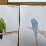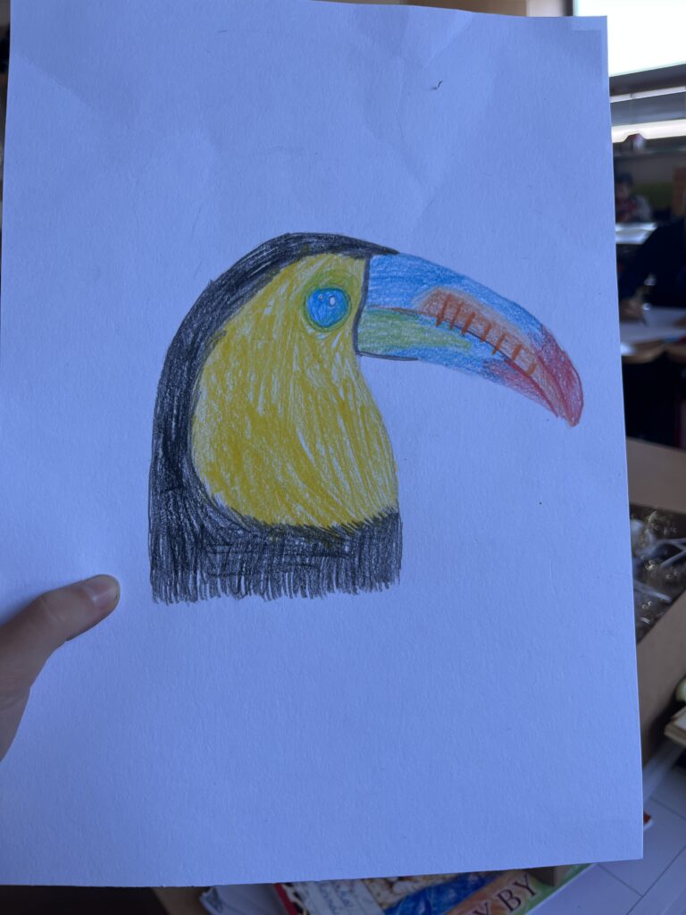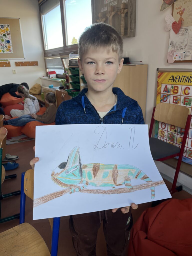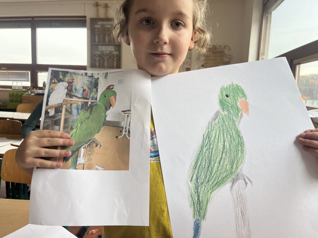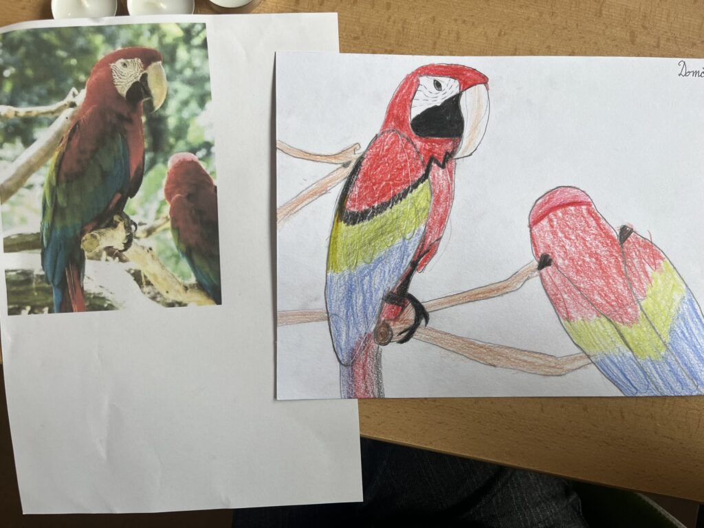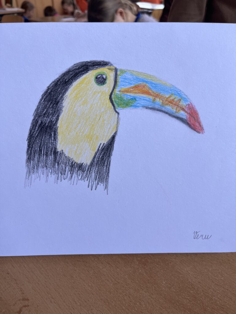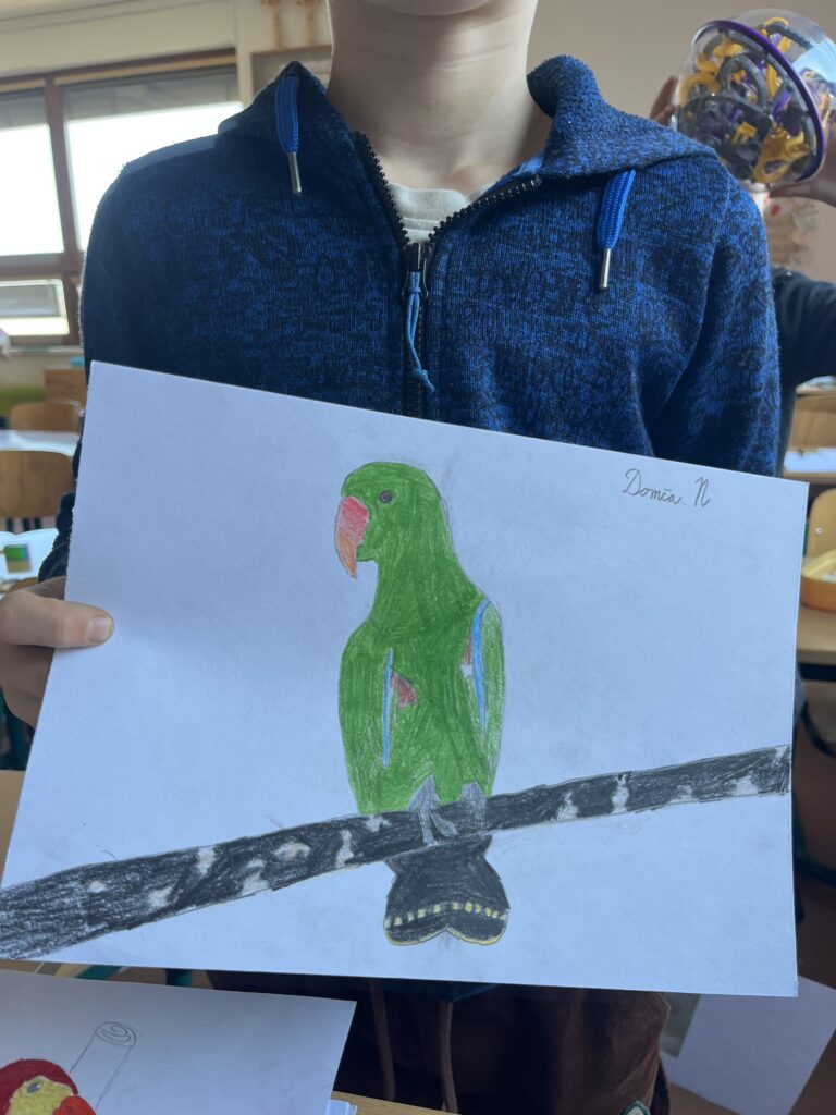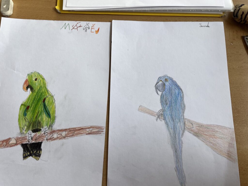 Před týdnem jsme se s dětmi ve školní družině vypravili do světa barevných per a tropických hlasů. Zhlédli jsme poutavé představení o papoušcích, které nás provedlo jejich životem, chováním i neuvěřitelnými schopnostmi. Na závěr představení dostaly děti úkol – nakreslit vlastního papouška. A fantazii se opravdu meze nekladly! Vznikli barevné ary, hraví tukanové i tajemní amazoňané. Každý obrázek měl svůj příběh a děti si na nich daly záležet.
