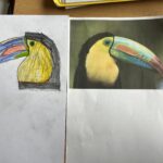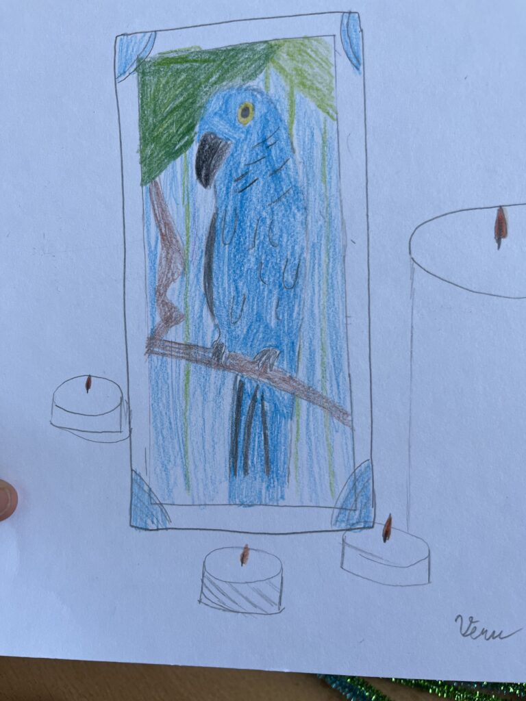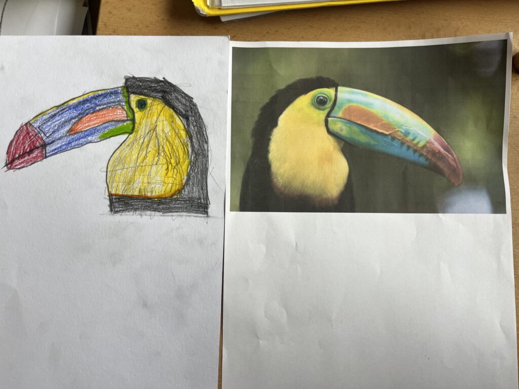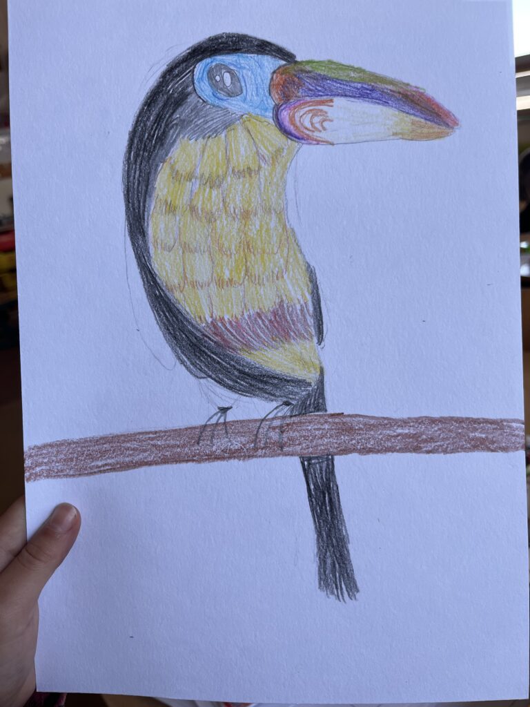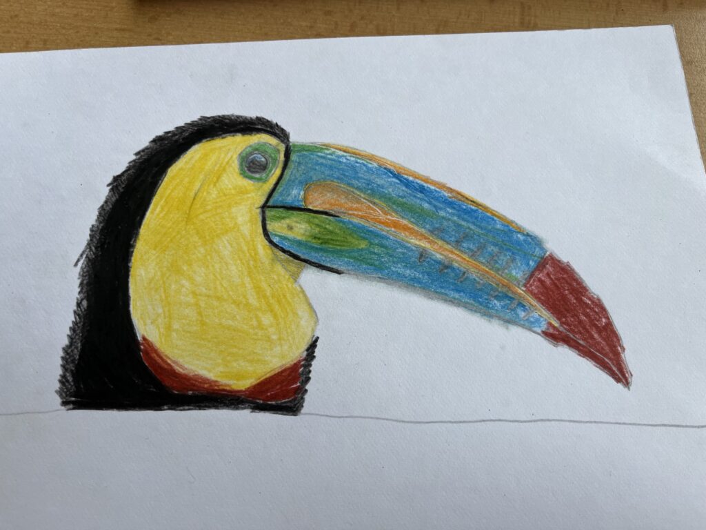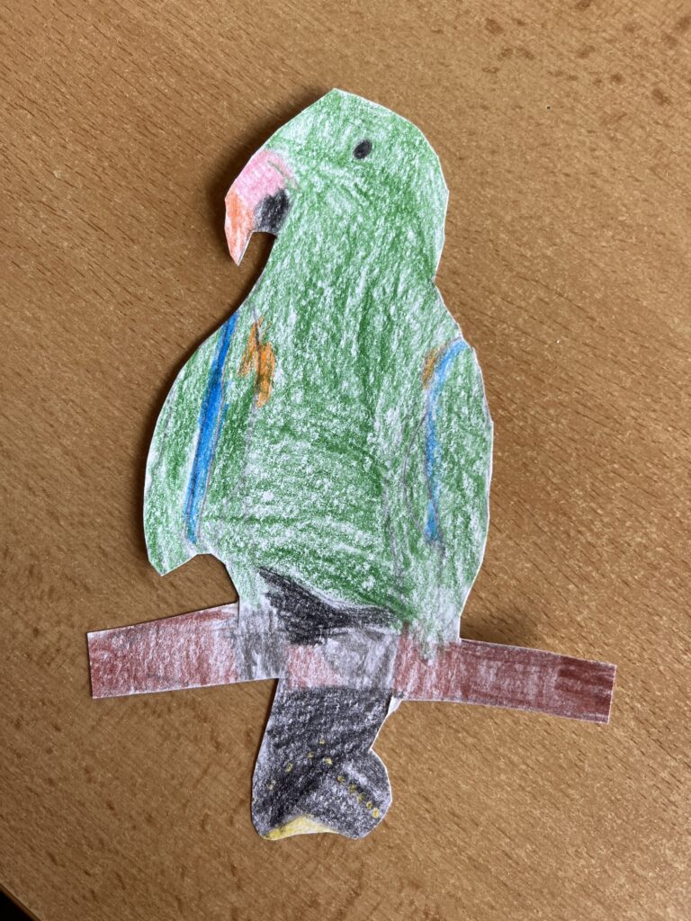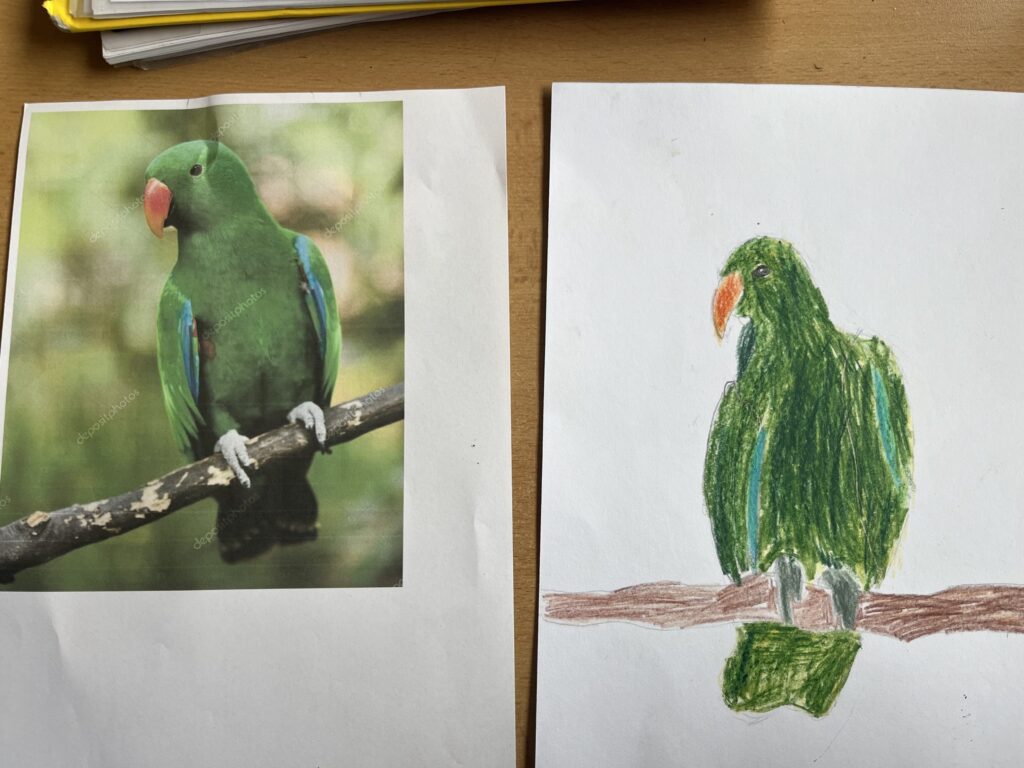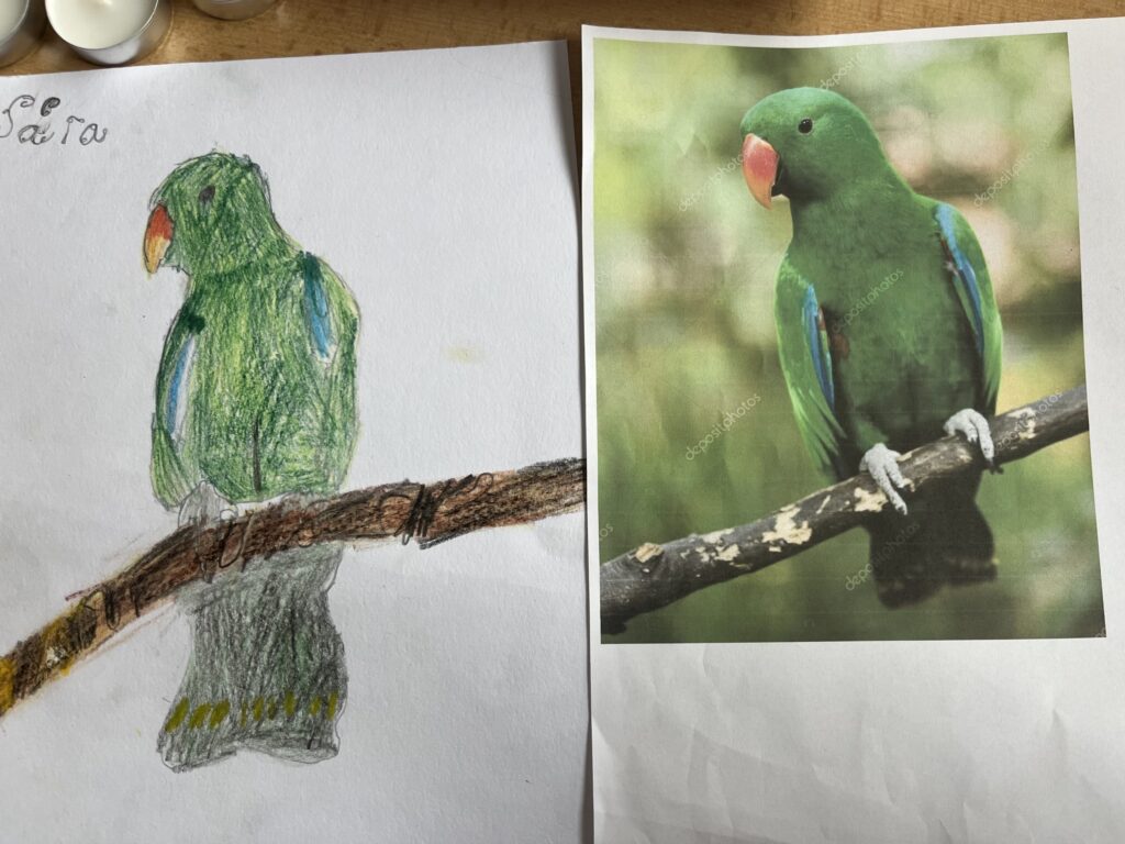 Před týdnem jsme se s dětmi ve školní družině vypravili do světa barevných per a tropických hlasů. Zhlédli jsme poutavé představení o papoušcích, které nás provedlo jejich životem, chováním i neuvěřitelnými schopnostmi. Na závěr představení dostaly děti úkol – nakreslit vlastního papouška. A fantazii se opravdu meze nekladly! Vznikli barevné ary, hraví tukanové i tajemní amazoňané. Každý obrázek měl svůj příběh a děti si na nich daly záležet.