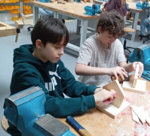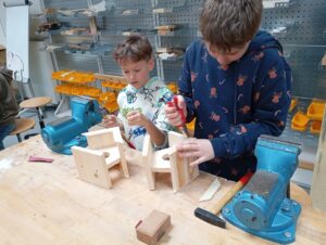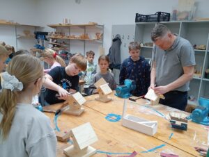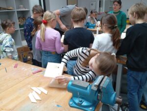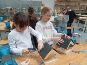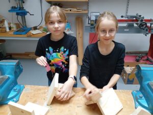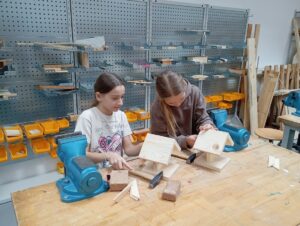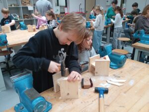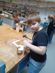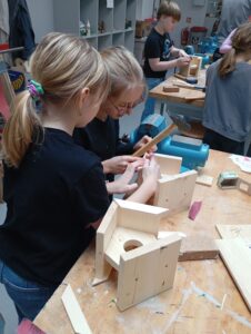 Děti opracovávaly dřevěné díly a podle instrukcí krmítko zkopletovaly.