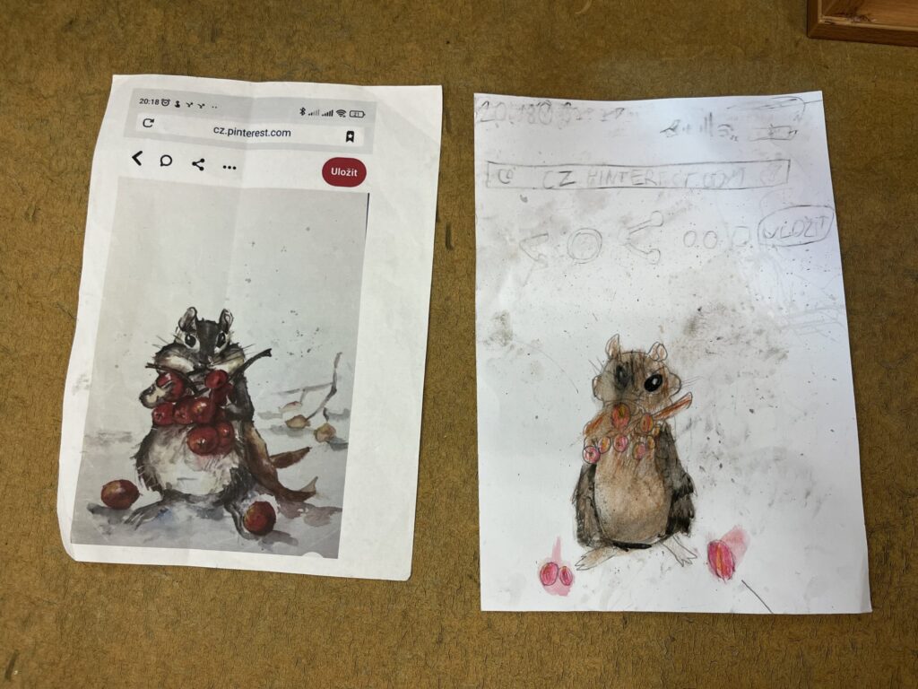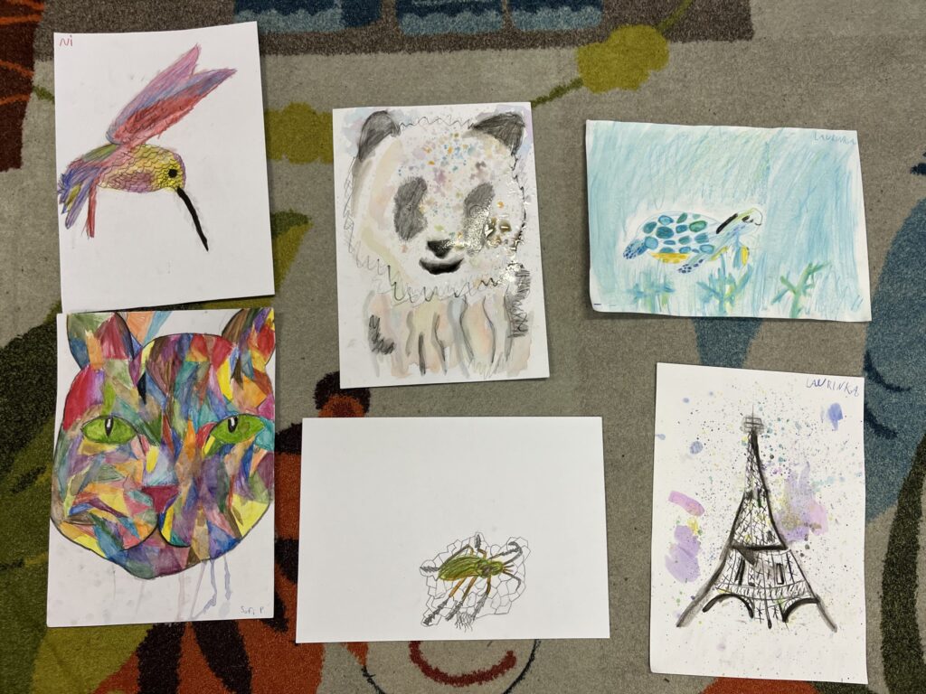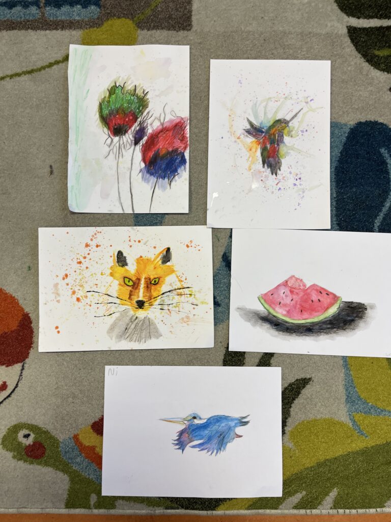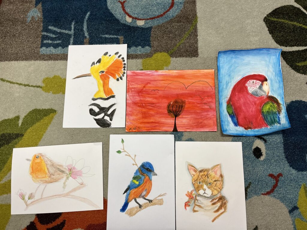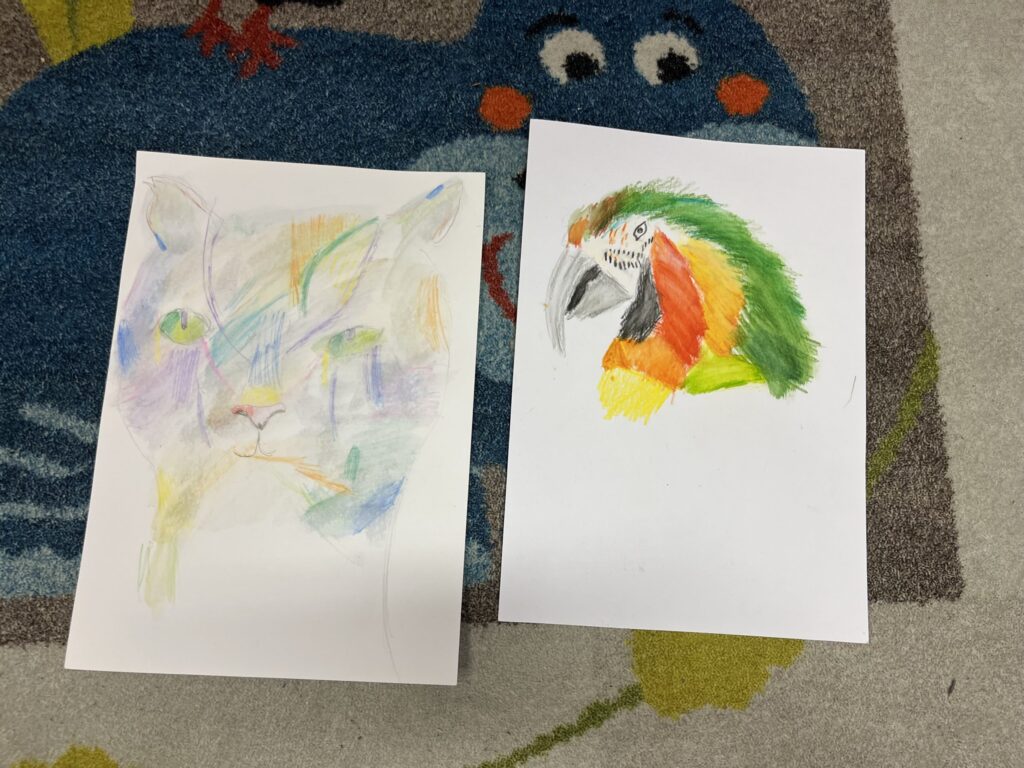 Během ledna a února jsme se v kroužku podrobně věnovali kresbě akvarelovými pastelkami. Děti navazovaly na své předchozí zkušenosti a dále rozvíjely své výtvarné dovednosti. Technika rozmývání jim pomohla posunout se zase o krok dál a lépe porozumět práci s barvou i stínováním. Společně jsme se učili více vnímat detaily a kresby pečlivěji propracovávat. Největší radost dětem přinesla tvorba podle jejich oblíbených námětů – zvířátek.