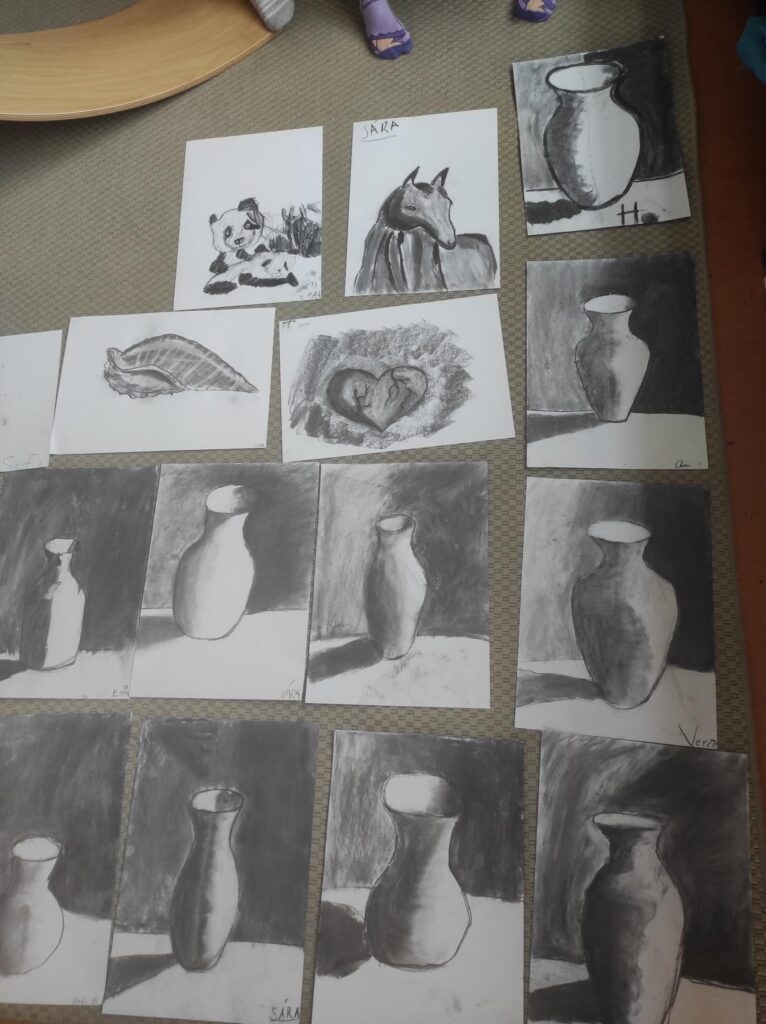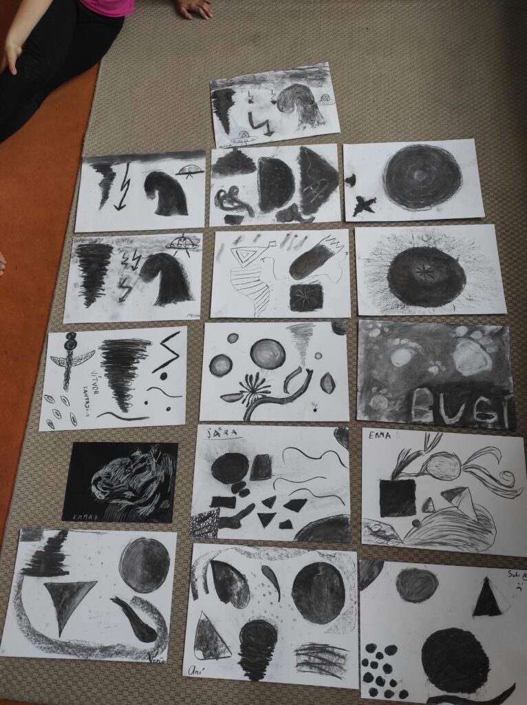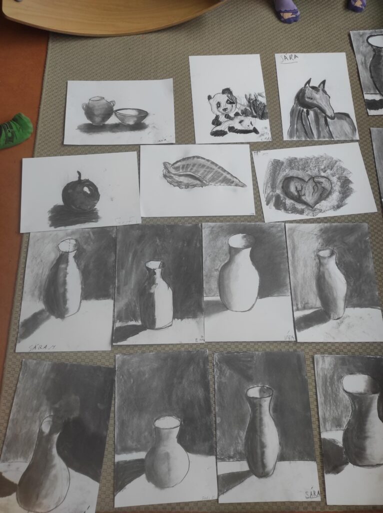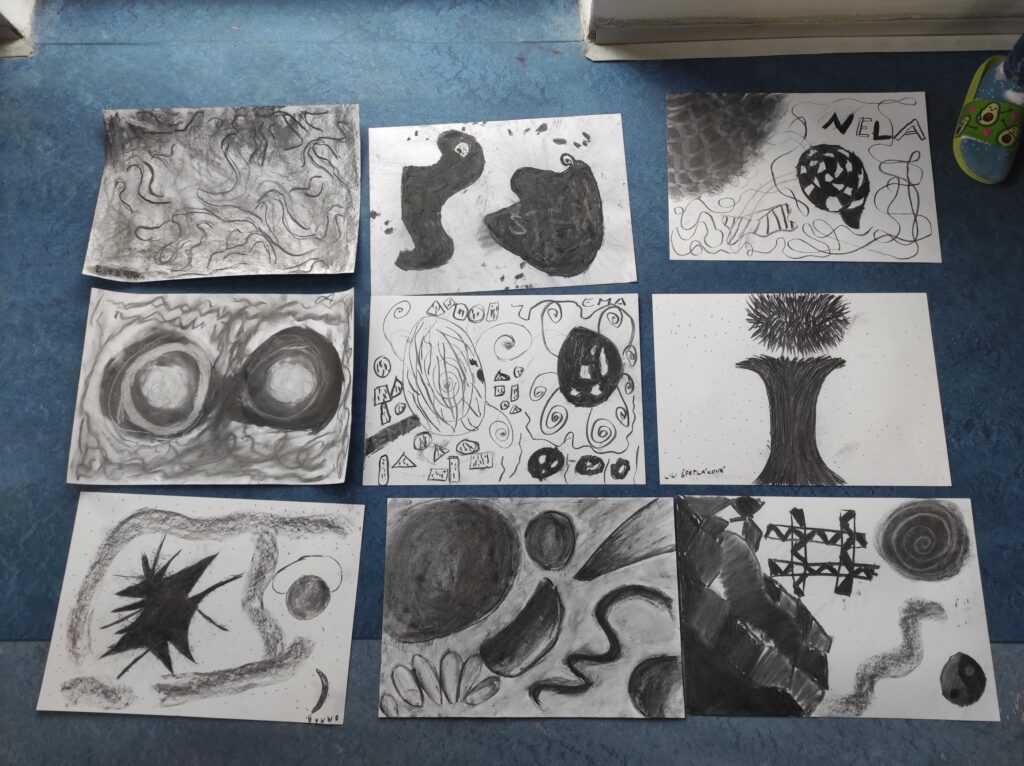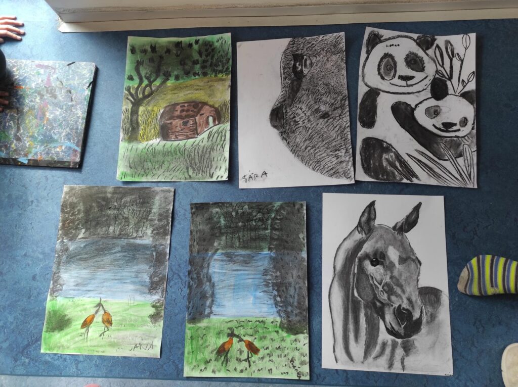 V dubnu jsme se pustili do nové výtvarné techniky. Kresba černým uhlem vypadá velice efektně, proto děti zaujala na první pohled. Děti bavilo, že obrázek je rychleji hotový než u kreslení tužkou. Prohlubovali jsme naše dosavadní znalosti a vyzkoušeli jsme různé předlohy obrázků. Kresby jsme fixovali lakem na vlasy, aby se nám nerozmazaly. Úklid po práci byl trochu náročnější, ale výsledky prací všech dětí stály za to.