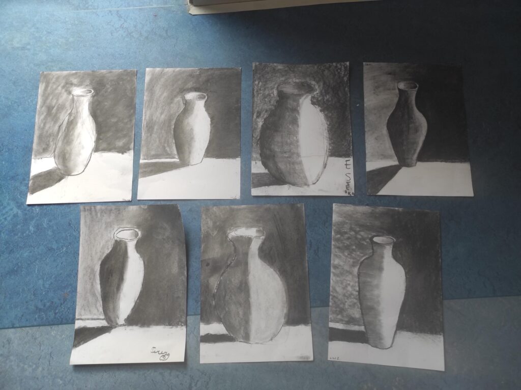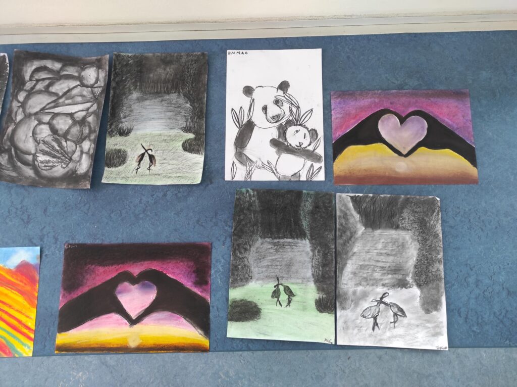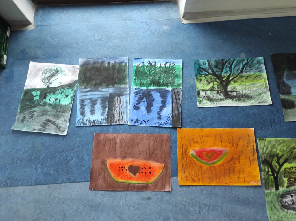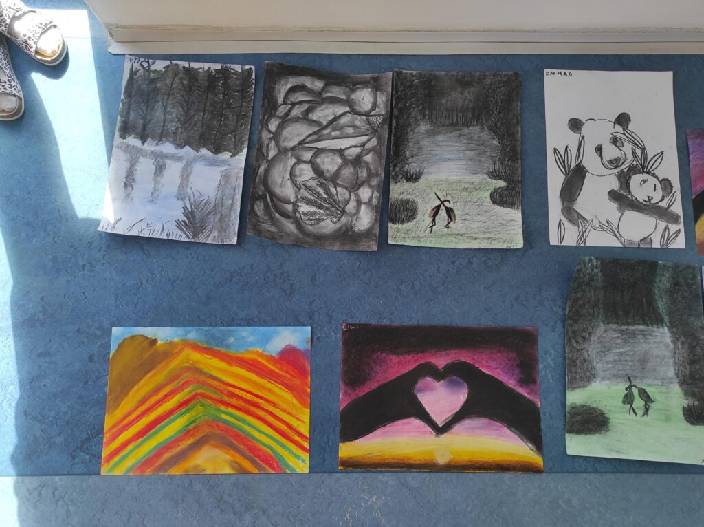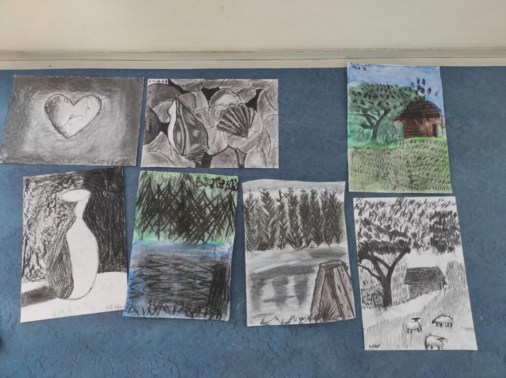 V dubnu jsme se pustili do nové výtvarné techniky. Kresba černým uhlem vypadá velice efektně, proto děti zaujala na první pohled. Děti bavilo, že obrázek je rychleji hotový než u kreslení tužkou. Prohlubovali jsme naše dosavadní znalosti a vyzkoušeli jsme různé předlohy obrázků. Kresby jsme fixovali lakem na vlasy, aby se nám nerozmazaly. Úklid po práci byl trochu náročnější, ale výsledky prací všech dětí stály za to.