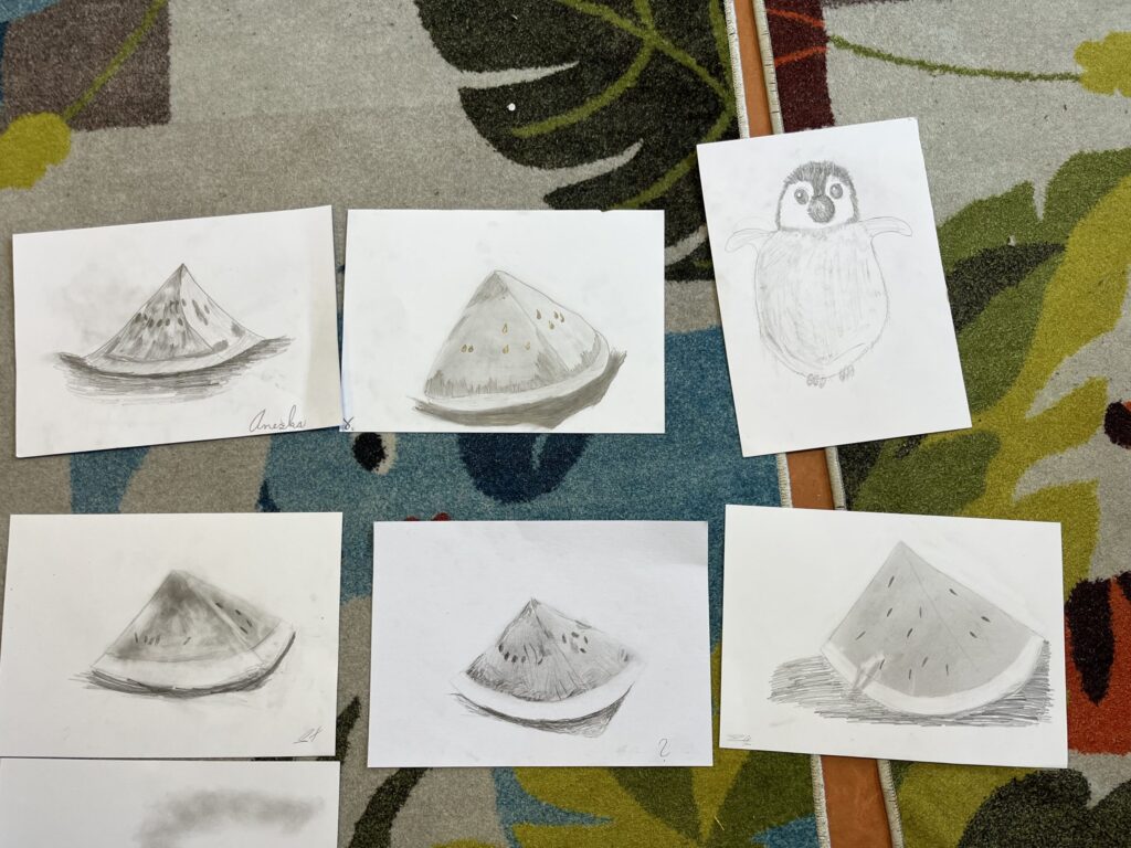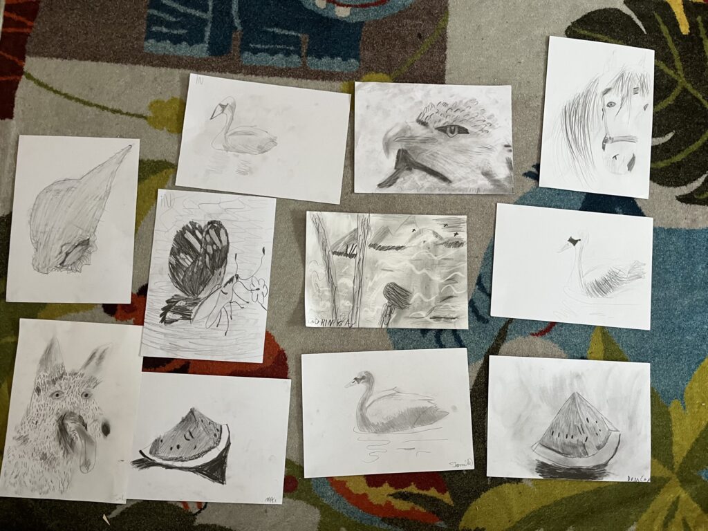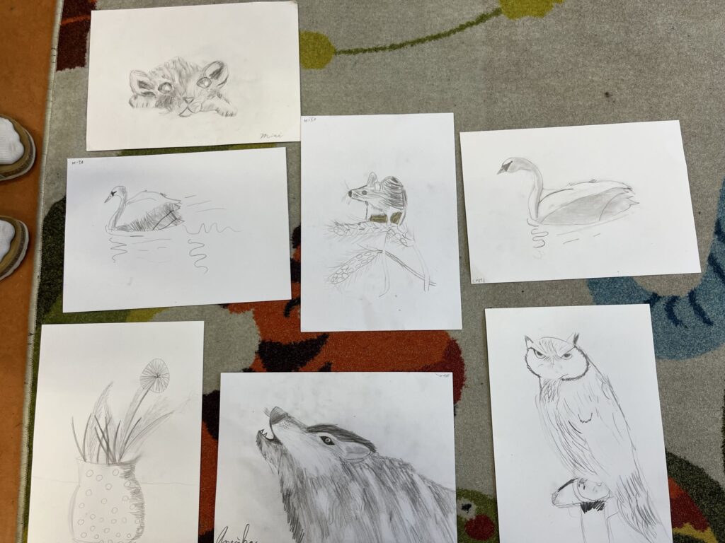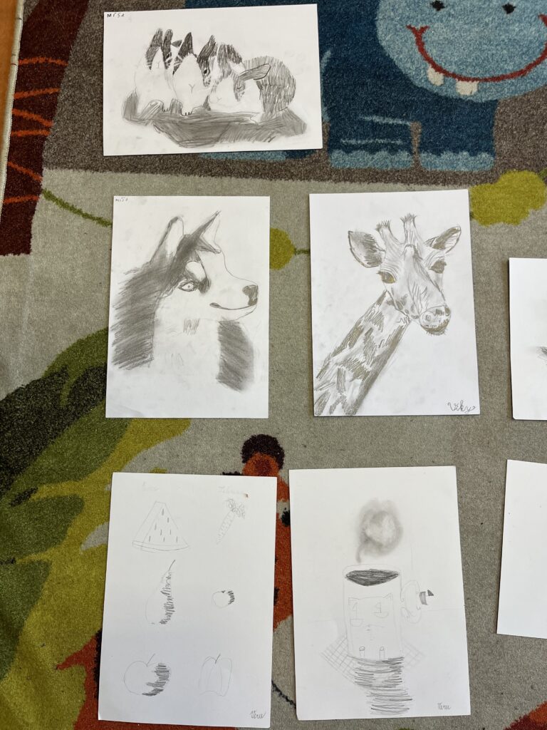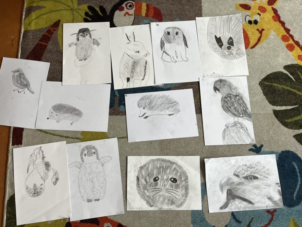 Základem kresby je kresba tužkou, proto jsme se této technice věnovali jako první. Naučili jsme se používat různé druhy tužek, plastickou gumu a rozlišovat světlo a stín. Kreslíme podle předloh, což je pro děti jednodušší. Děti se snaží přenášet na papír to, co skutečně vidí. Všímáme si detailů a rozlišujeme materiál, povrch a tvar, který kreslíme.