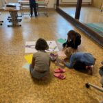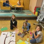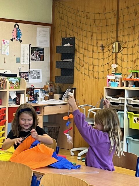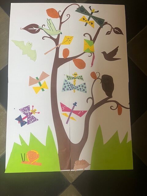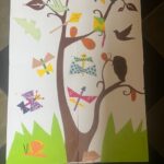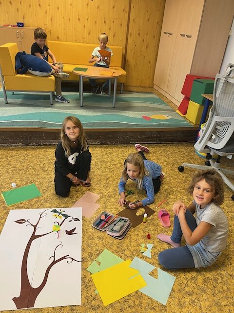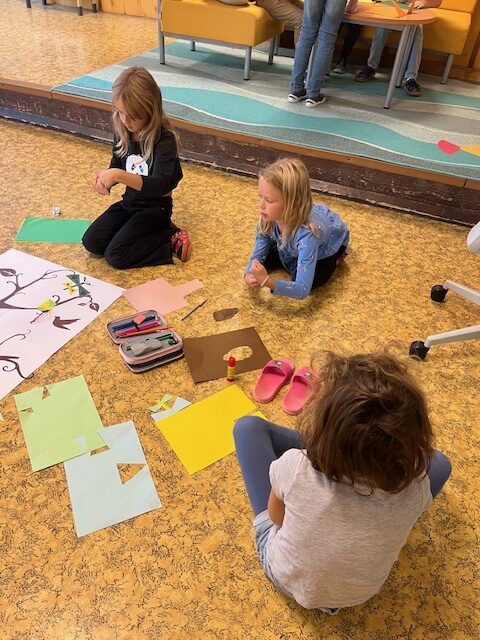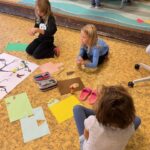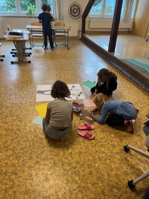 Holky dekorují plakátek a dělají draky z barevných čtvrtek a kluci jim pomáhají.