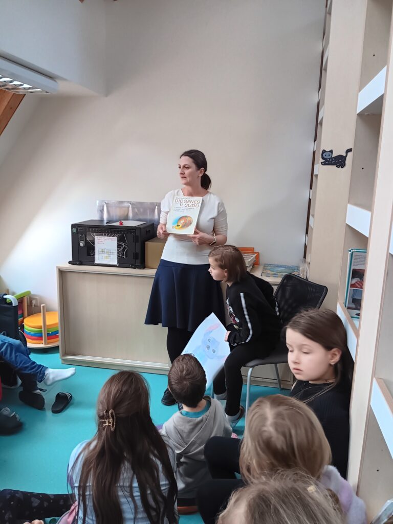 My jsme knihovnu poprvé navštívili v druhé polovině února, paní knihovnice si pro nás připravila knížku s názvem Diogenés v sudu se zajímavými příběhy. O další návštěvě budu děti informovat předem.