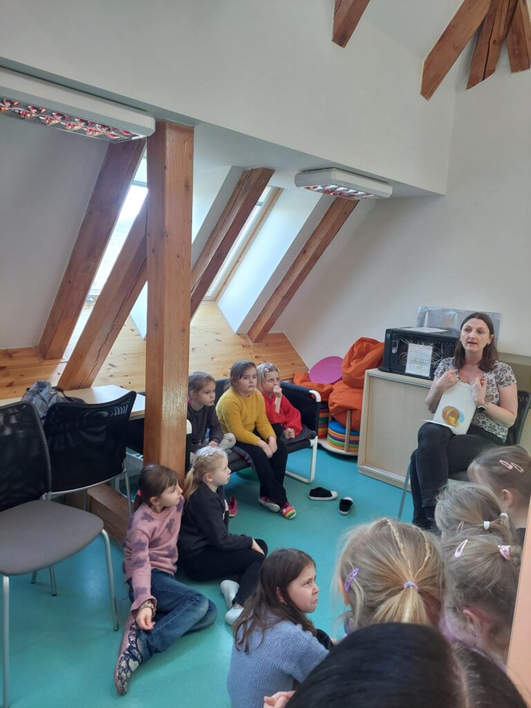 Paní knihovnice si pro děti připravila krátký program. Přečetla nám ukázky z knížky „Diogénes v sudu“. Doporučila také dětem vhodnou četbu. Doufáme, že se dětem v knihovně líbilo a že se četba stane jejich oblíbenou aktivitou.