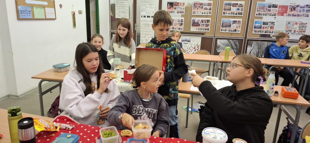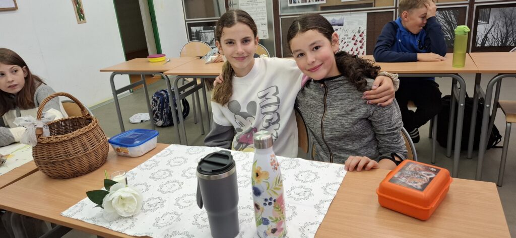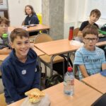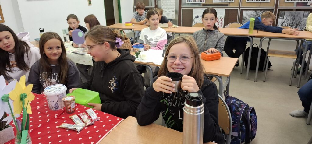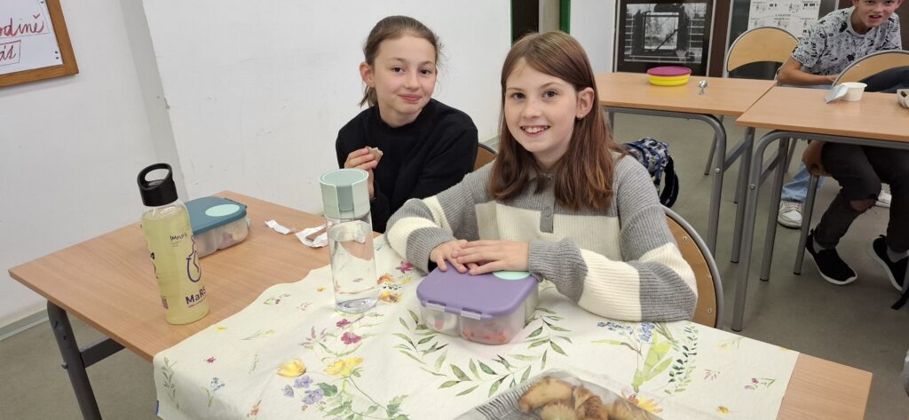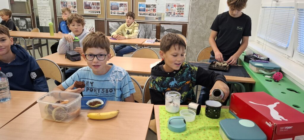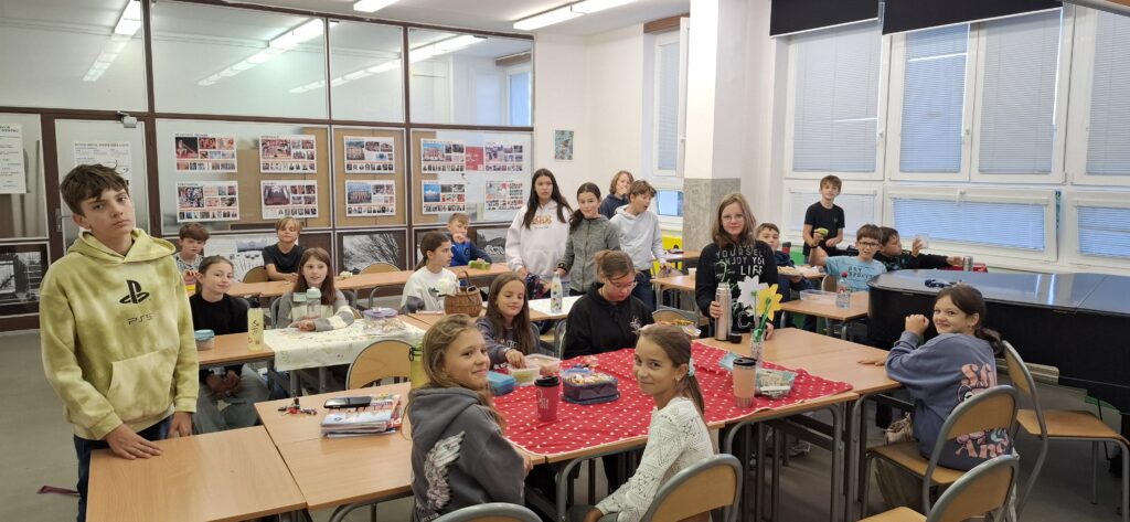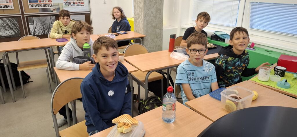 Již minulý týden jsme si akci „Pěšky do školy“ společně podrobně naplánovali. Žáci měli bezva nápady. Domluvili jsme se, že se budeme celý týden vzájemně podporovat a motivovat chozením do školy v tzv. četách. Žáci byli velmi kreativní v pojmenování svých skupin. První četa „Tajemné sigma brambůrky“ má 10 členů a schází se na Vráži u Bambule. Četa „Mokrý pes“ má čtyři členy a sraz má na Mokropeském náměstí. V Jičínské ulici se schází četa „Spálené děti“ (4 žáci) a u lesíka nad školou se setkává četa „OI“ (3 žáci). V 7:20 jsme se všichni, včetně paní učitelky třídní, sešli před školou. Atmosféra výborná. Kromě dvou žáků, kteří dnes byli nemocní, dorazili všichni buď pěšky nebo na koloběžkách. Ulovili jsme pro naši třídu prvních krásných dvacet bodů! Následovala společná snídaně ve třídě . Heslo snídaně bylo: „Udělejme si to pěkné.“ Někteří si vyzdobili stůl ubrusy, ubrousky, dokonce vázou s květinami, žáci si vzájemně nabízeli své přebytky, v nabídce byla spousta buchtiček napečených od hodných maminek, termosky s kakajíčkem, dokonce teplá kaše a mnoho dalšího. Povídali jsme si, byla legrace a celkově jsme měli bezva start dne.