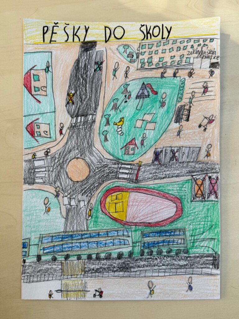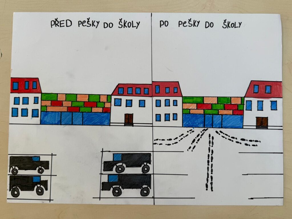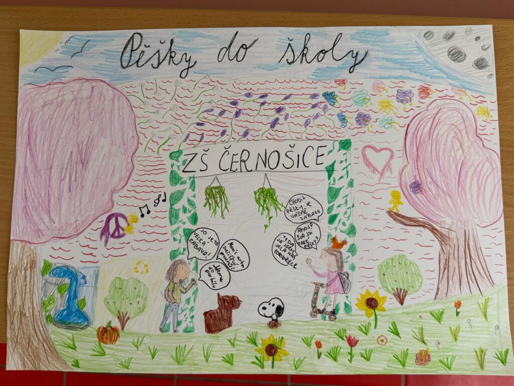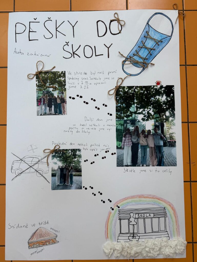 V týdnu 15–19. září se naše třída opět zúčastnila akce pěšky do školy. Bohužel se nám letos nepodařilo navázat na úspěch z loňského roku, protože každý den alespoň někdo přijel ke škole autem a většinou nešlo pouze o jednoho žáka. Nicméně snaha se žákům nedá upřít, mnozí se snažili alespoň část cesty jít pěšky nebo auto vyměnit za kolo. Ve výtvarné výchově děti vytvořily na téma akce velmi zdařilé plakátky, kterými jsme si vyzdobili třídu.