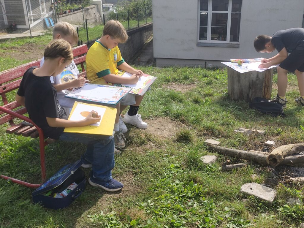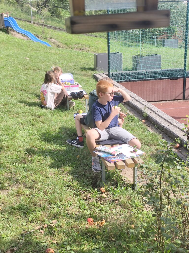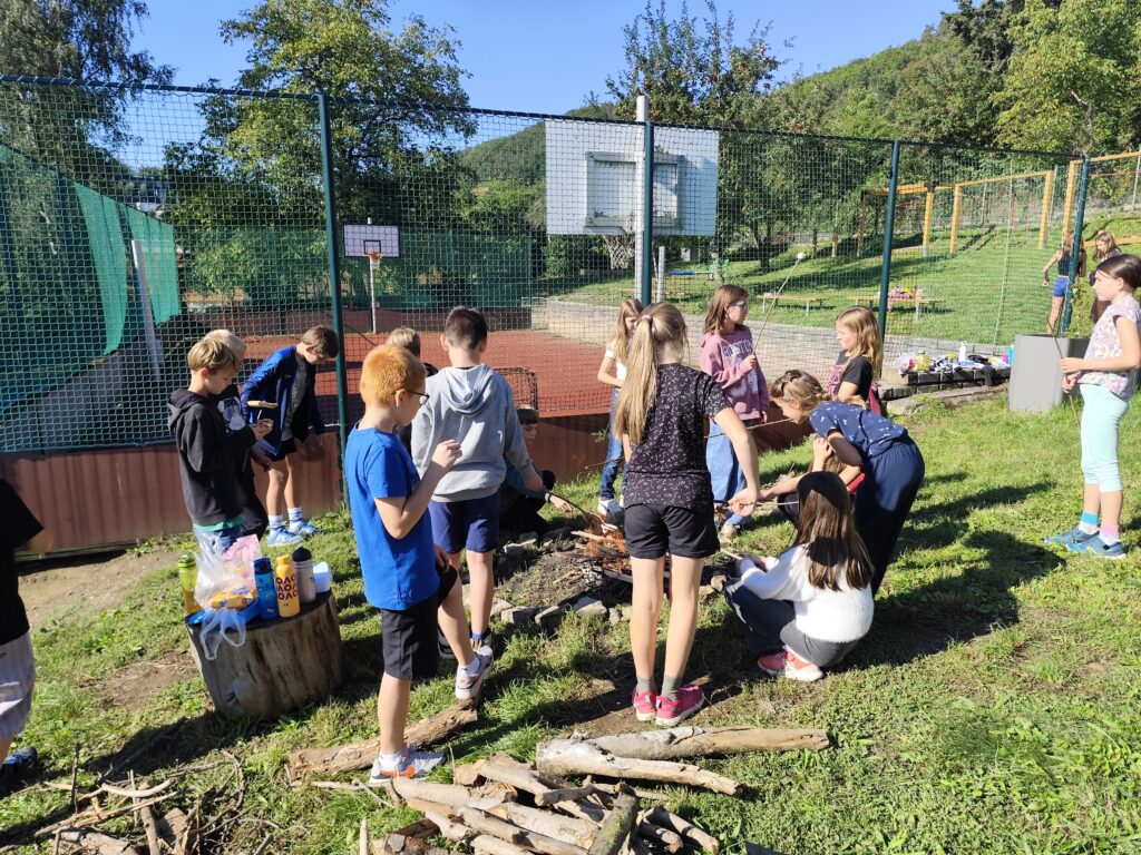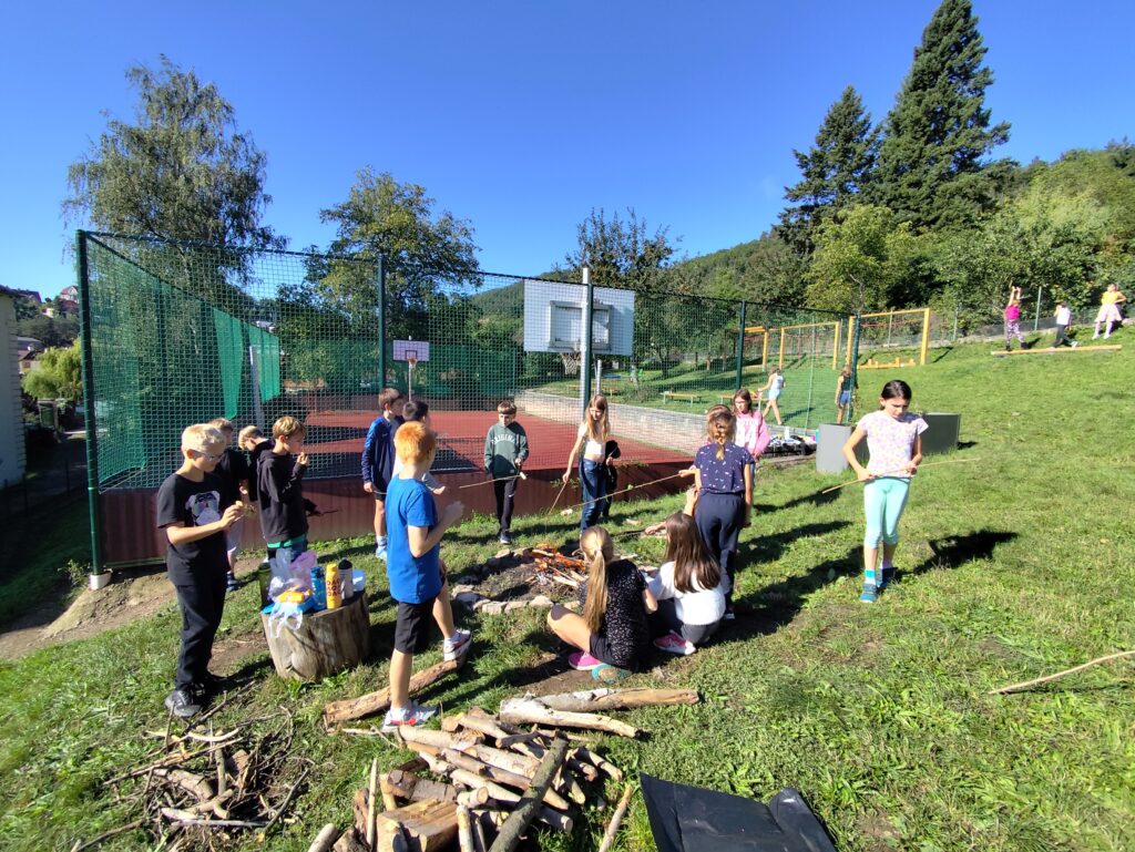Užíváme si podzim na školní zahradě. Ve čtvrtek jsme si dopoledne hodně užili. Hráli jsme hry, uklízeli školní zahradu, založili jsme oheň a opékali, co se dalo.