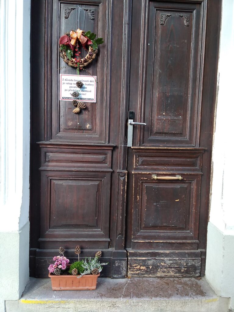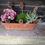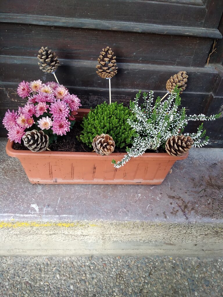V říjnu jsem s dětmi navštívila zahradnictví a zakoupila dle výběru dětí – chryzantému, hebe a vřes. v prostoru před zahradnictvím děti nasbíraly šišky na doplnění do truhlíku.