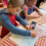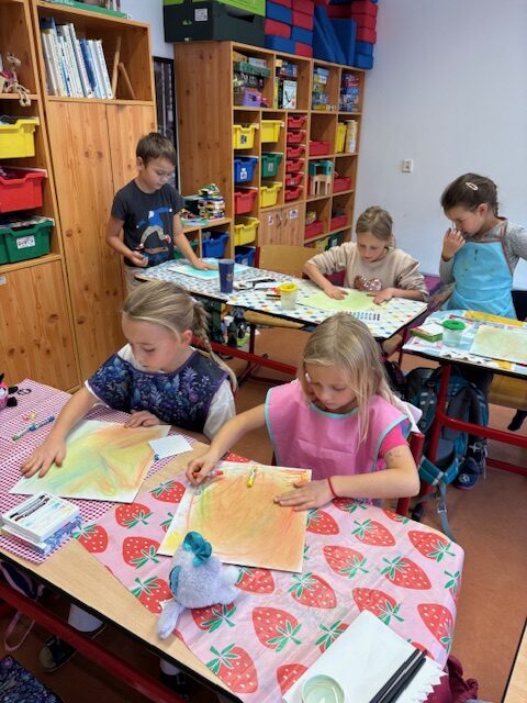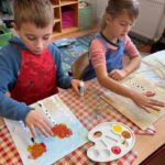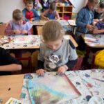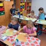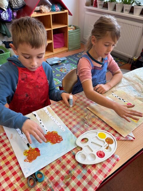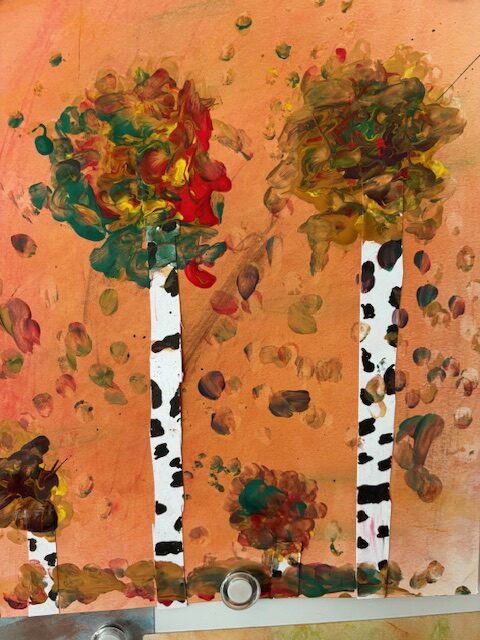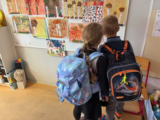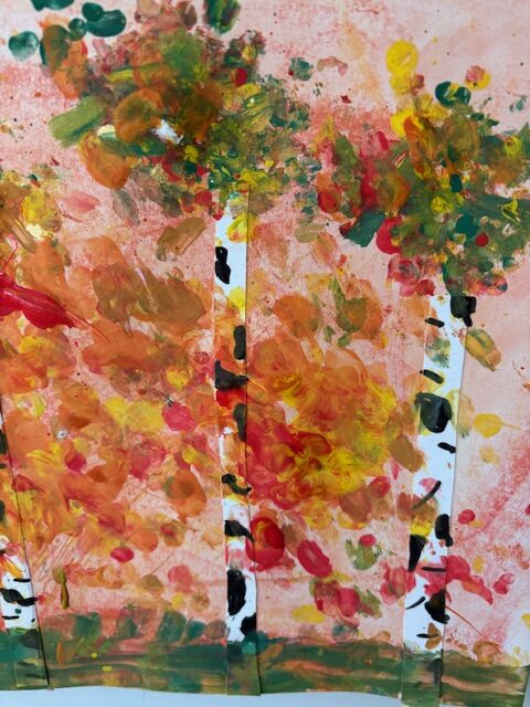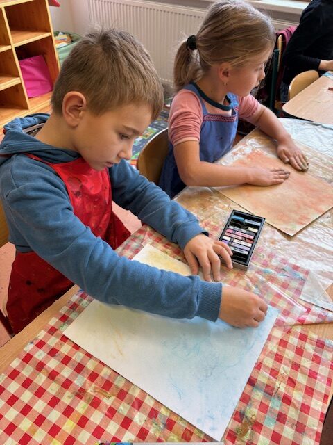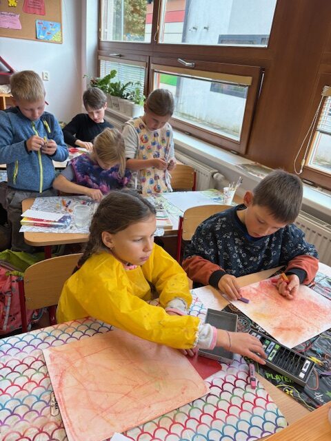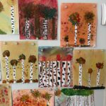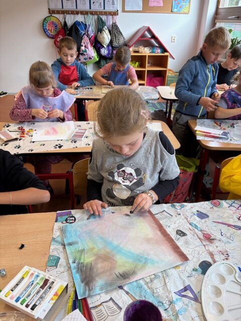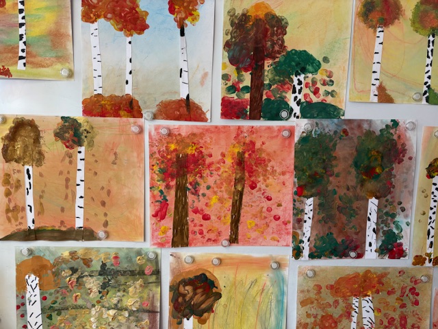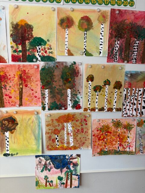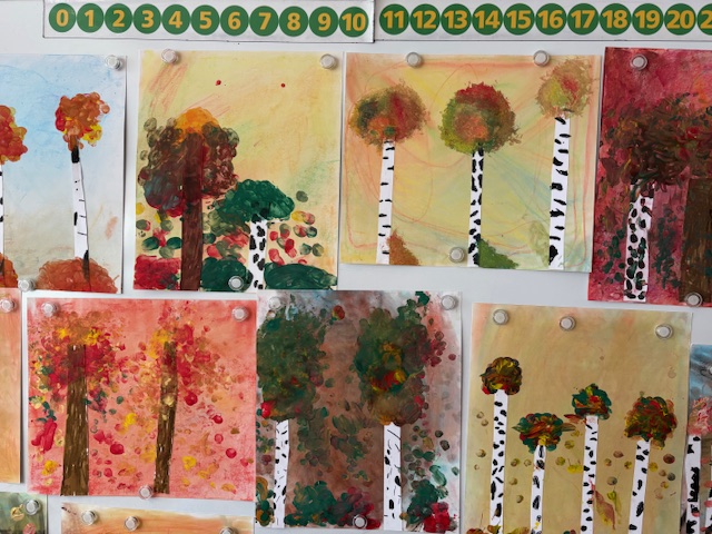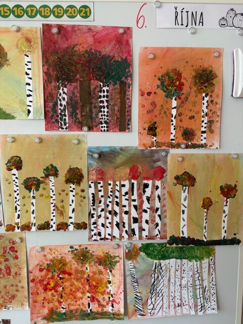Tento týden jsme se poprvé pustili do práce s pastely – a musíme říct, že nás to opravdu bavilo! Nejprve jsme si pastelovými křídami vytvořili pozadí v podzimních odstínech. Poté jsme vystřihli pruhy čtvrtky, které jsme následně nalepili na papír. Přidali jsme pár černých skvrn a z obyčejných pruhů se rázem staly kmeny bříz. Nakonec jsme se pustili do tvorby korun stromů – někdo pracoval prstíčky, jiný použil štětec. Naše břízky se oblékly do podzimního listí. Některé lístky ještě poletovaly vzduchem, jiné už se snášely k zemi. Když jsme všechna dílka vystavili, vznikl nám nádherný třídní březový háj.