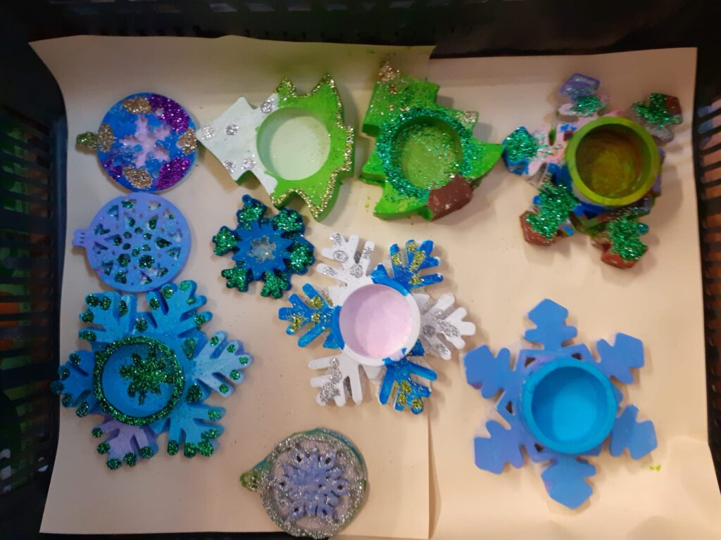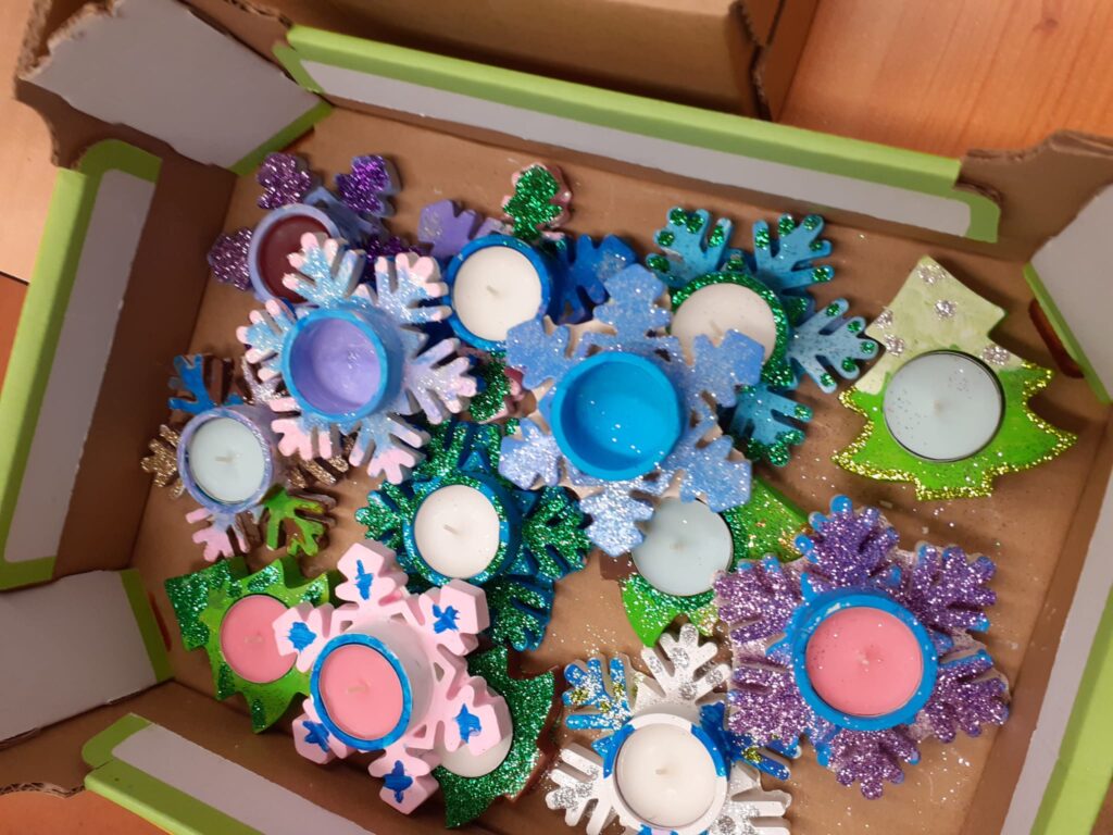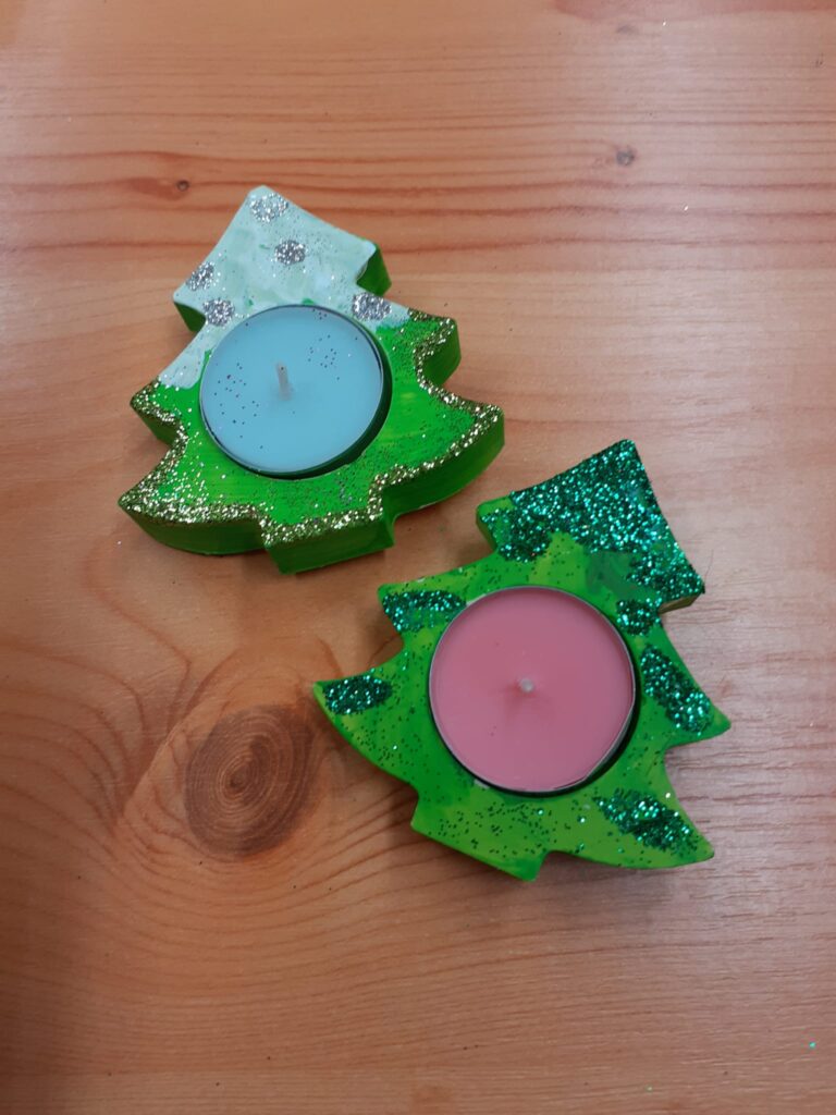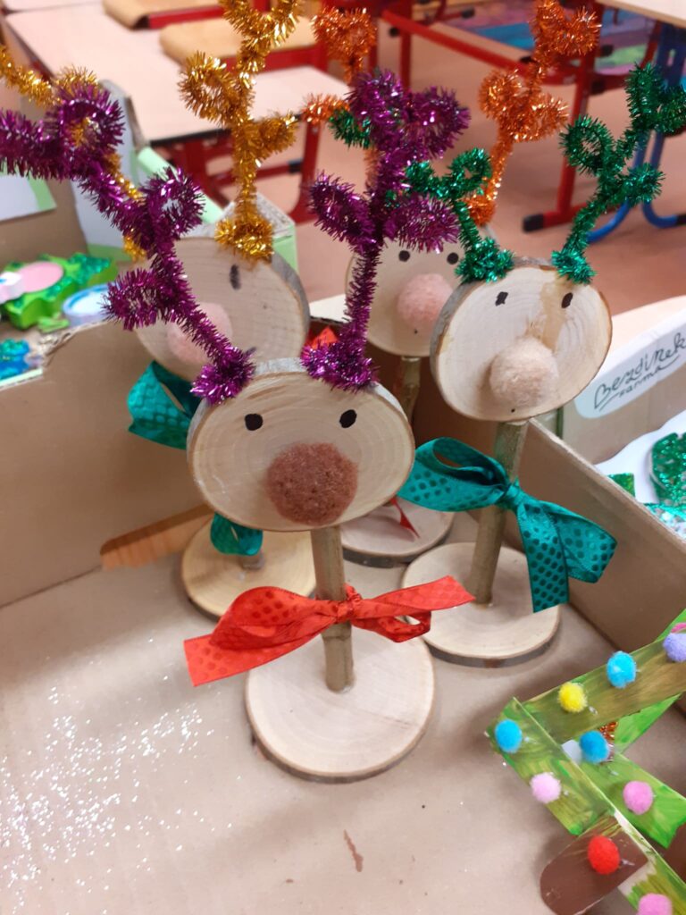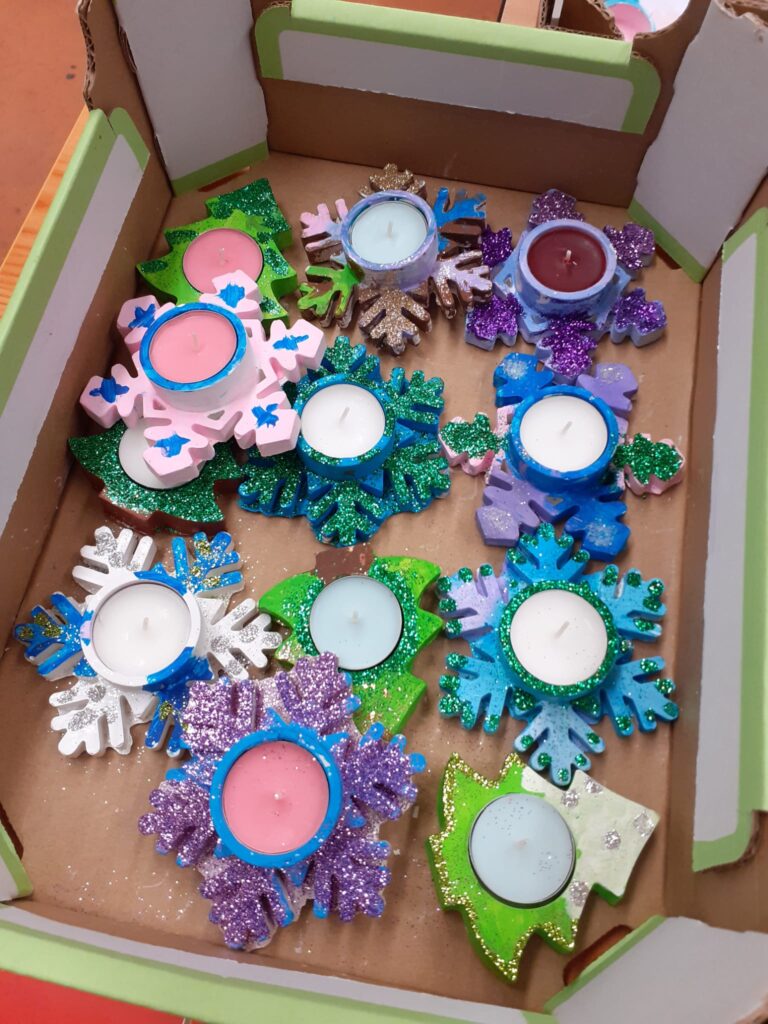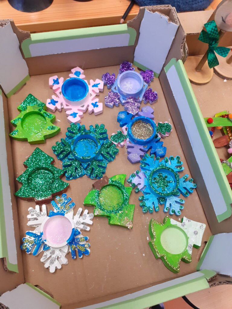 V oddělení Žirafek jsme letos dělali vánoční svícny a ozdoby ze sádry, stromečky ze dřívek a sobíky.