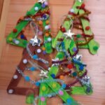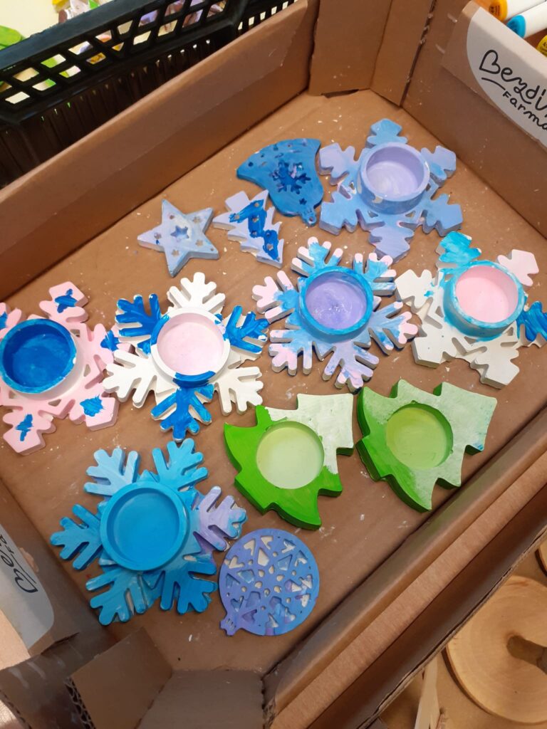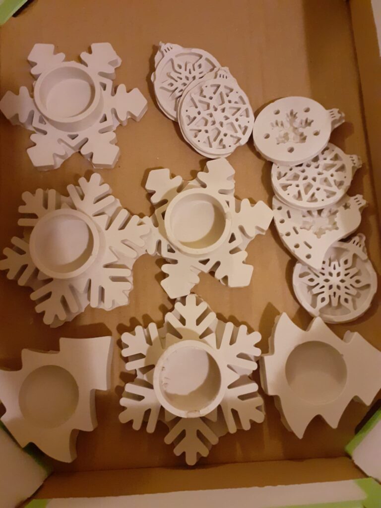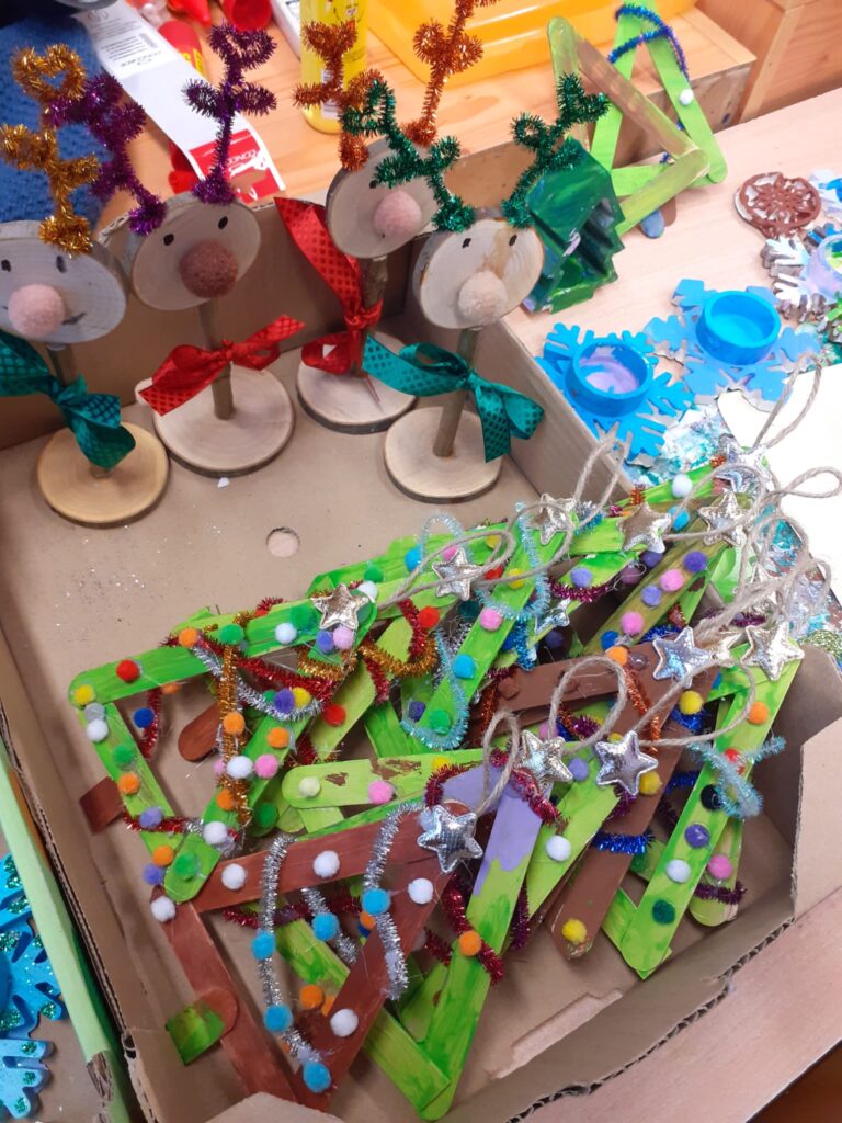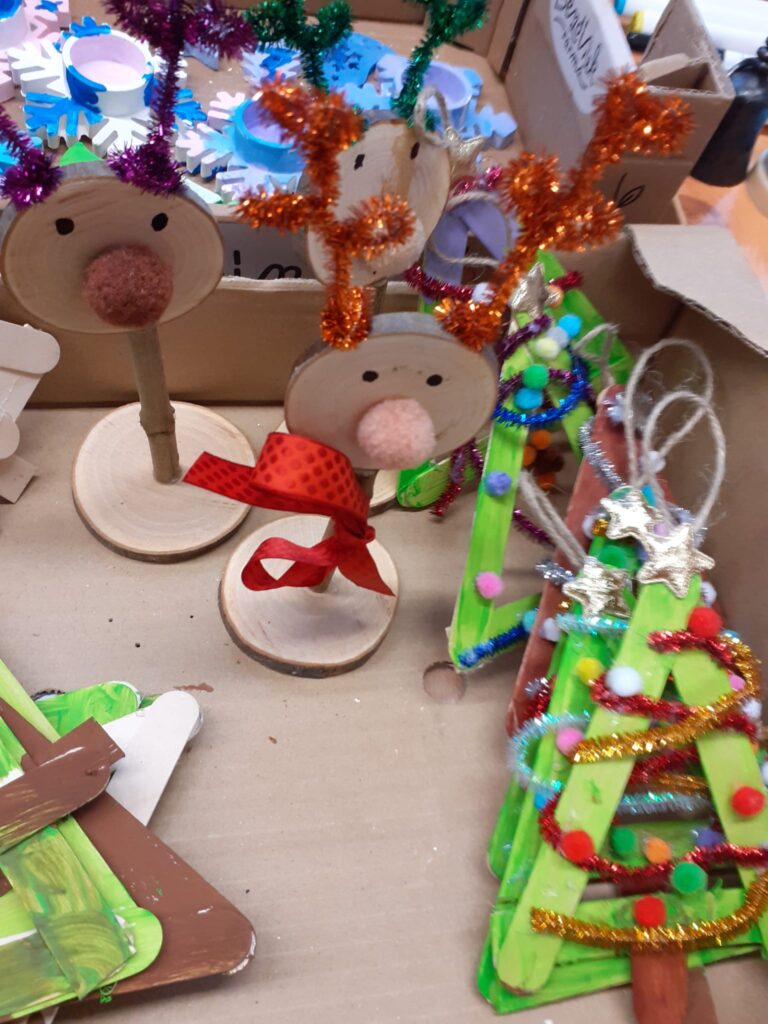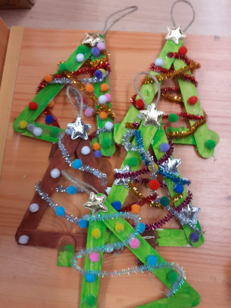 V oddělení Žirafek jsme letos dělali vánoční svícny a ozdoby ze sádry, stromečky ze dřívek a sobíky.