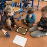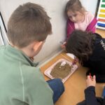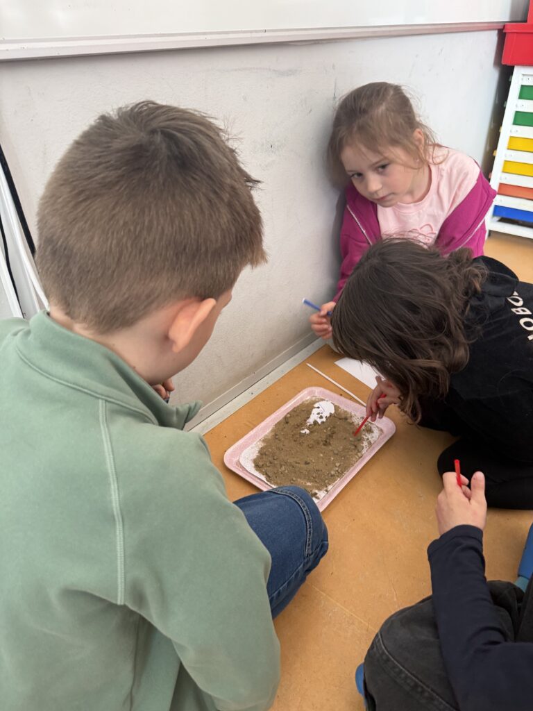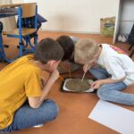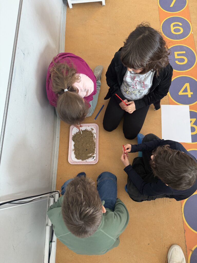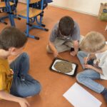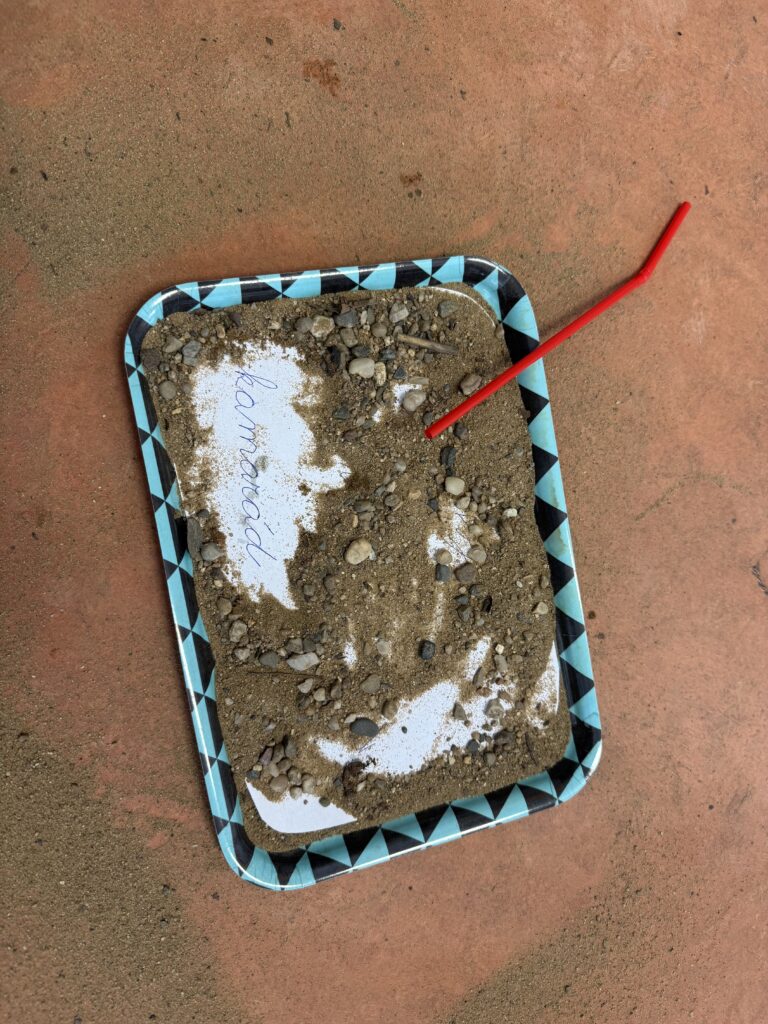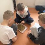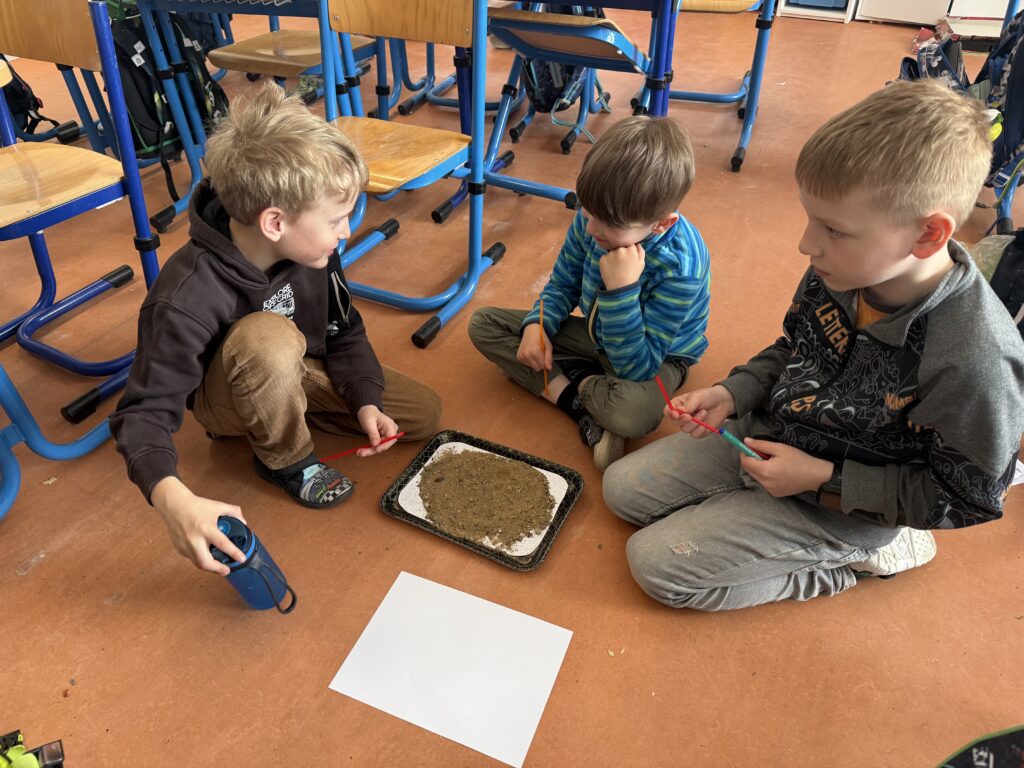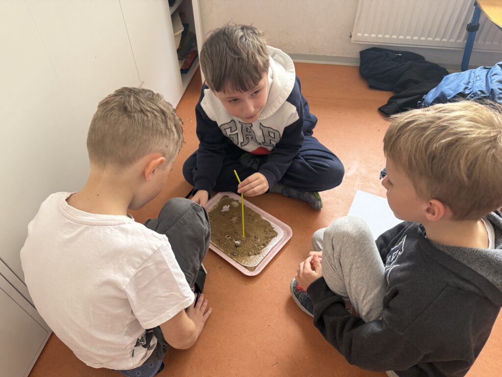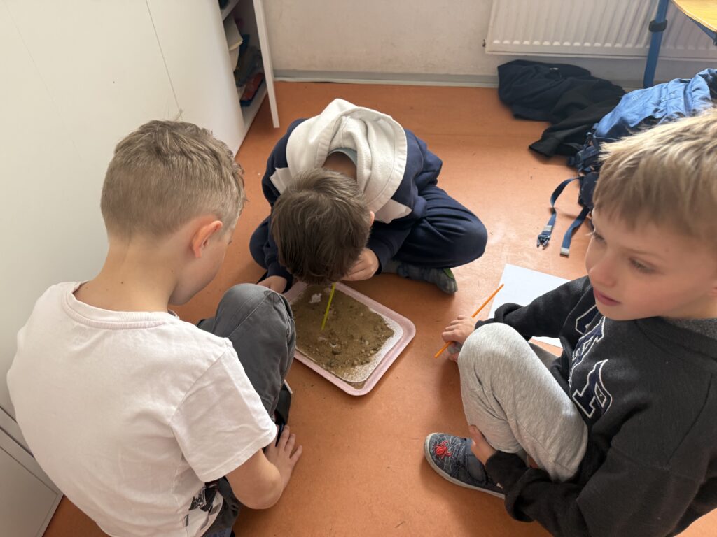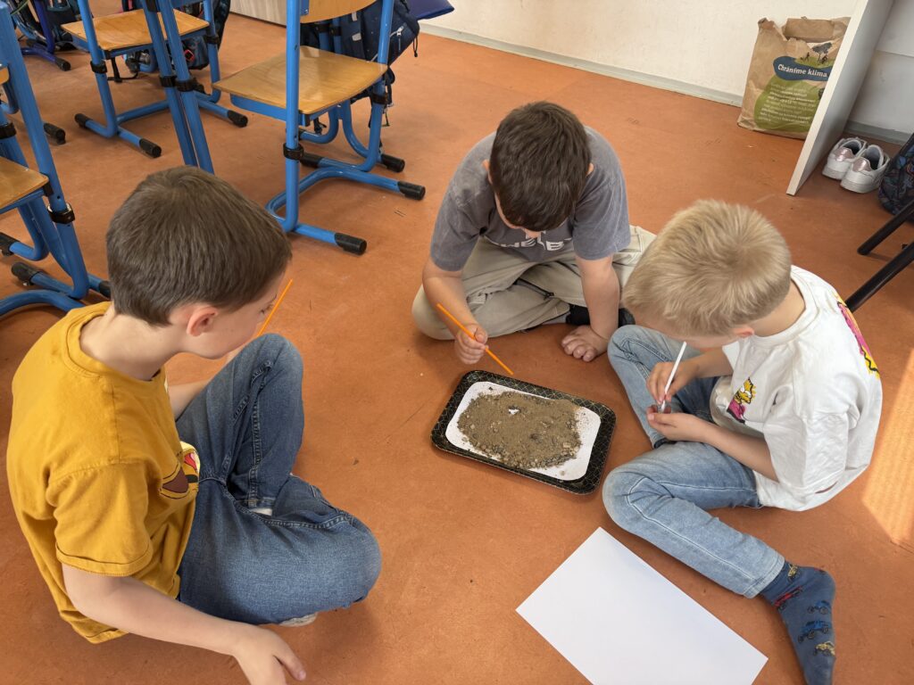 Žáci se rozdělili do pěti skupin a každá skupina pracovala s tácem naplněným pískem a brčky. Pomocí foukání brčkem postupně odkrývali schovaná slova, ze kterých následně společně skládali vlastní příběhy.