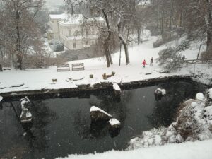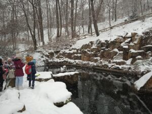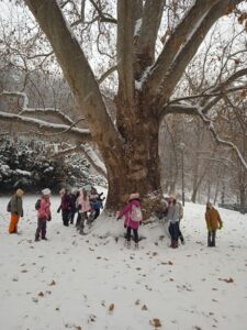 Dnešní ráno nás přivítalo sněhovou peřinou, která vše udělala krásné, bílé, pohádkově zimní. Vydali jsme se do Národopisného muzea na program Půjdem spolu do Betléma. Do Prahy jsme dorazili s velkým předstihem. Čas do programu v muzeu jsme využili k pěkné zimní procházce Kinskými sady. Popovídali jsme si o významu parků ve městě, o historii vrchu Petřín. Děti zjistily, že aby obejmuly památný 180let starý platan javorolistý, musí jich být osm. Prošli jsme se k Neptunovu jezírku, obdivovali jsme zamrzlé vodopády i klid, který tu byl, přestože jsme byli nedaleko rušných ulic.  Škvírami ve stavební ohradě jsme se podívali na dřevěný kostelík, který je v současné době v rekonstrukci. Děti se vydováděly na sněhu, byla i malá koulovačka.