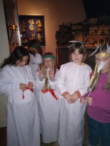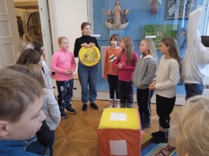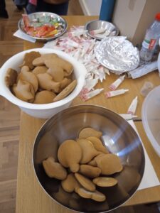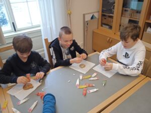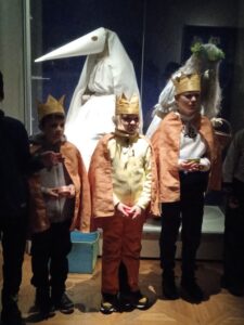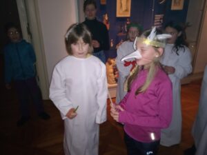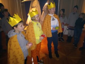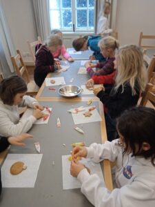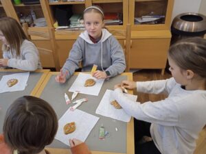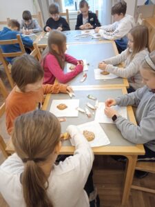 S paní lektorkou se děti nejdříve pomocí obrázků seznámily s českými tradicemi od sv. Mikuláše po Tři krále. Děti velmi pěkně spolupracovaly, odpovídaly a doplňovaly, co se dozvěděly v Muzeu betlémů, při vánočním zpívání s Cenerenterolou a dalších školních i soukromých aktivitách. Přednesly společně básničku Dopis Ježíškovi, kterou se někteří dobrovolně naučili. Pak následovala práce ve skupinách, kdy se děti věnovaly jednotlivým konkrétním svátkům a tradicím. Pracovaly s pracovními listy. Dalším úkolem bylo formou dramatizace představit „svůj“ svátek, tradici ostatním. Děti se do dramatizace pustily s vervou a během velmi krátké chvíle vymyslely a předvedly moc pěkná minipředstavení. Jako poslední část programu nás čekalo zdobení perníčků. Perníčky voněly a lákaly k ochutnání. Děti je zdobily cukrovými barevnými polevami. Někteří neodolali a perníčky ochutnali. Jak jsme předpokládali, část perníčků se domů dostala ne v batůžcích, ale putovaly v bříškách dětí.