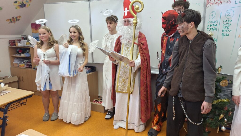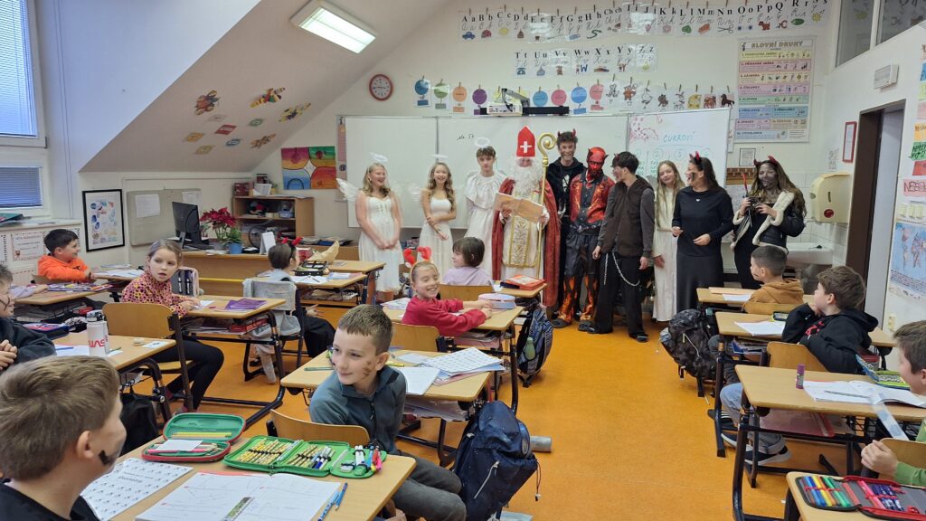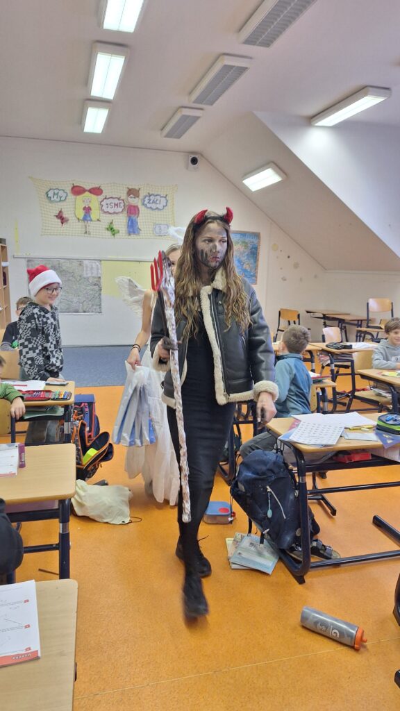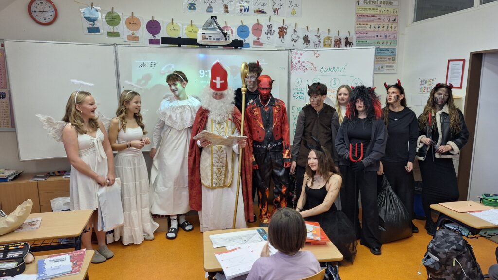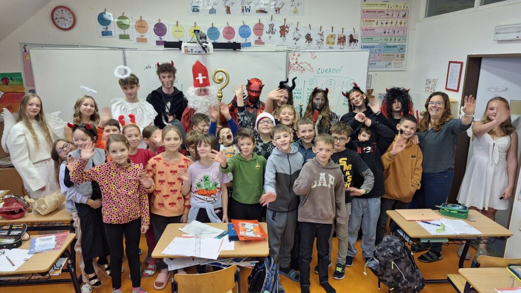 I letos školou opět chodili Mikuláš, andělé a čerti – akce, na kterou se děti moc těší celý rok. Přípravu této oblíbené tradice mají na starosti žáci 9. tříd, kteří se postarali nejen o kostýmy, ale i příjemnou atmosféru v celé škole.