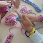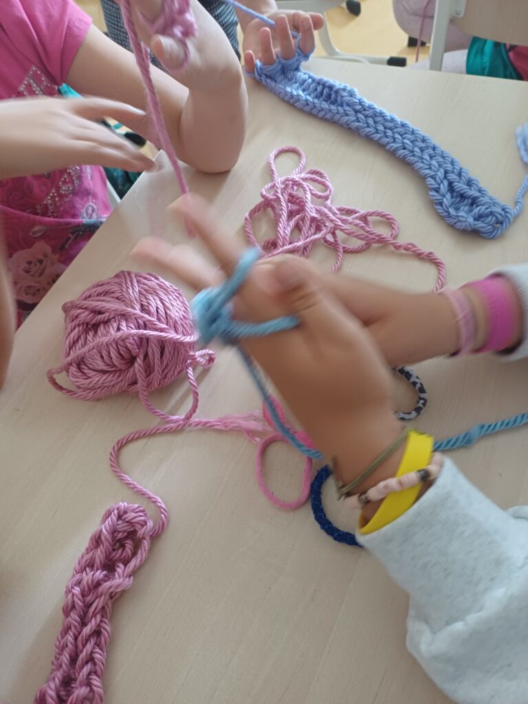 S příchodem chladnějších dnů jsme se naučili plést šály na rukou. Děti si samy vybíraly barvy přízí a s velkým zaujetím sledovaly, jak jim pod rukama vzniká něco praktického a krásného.