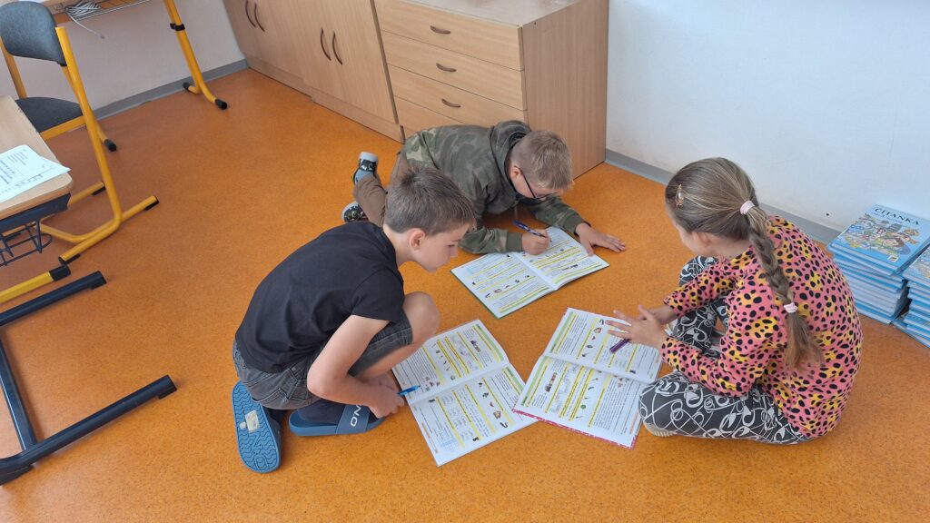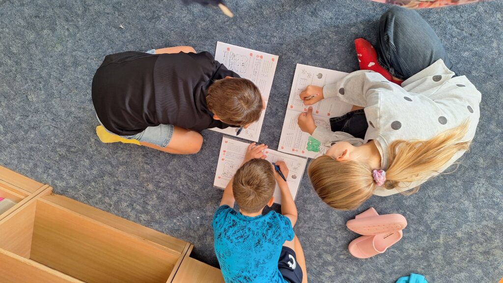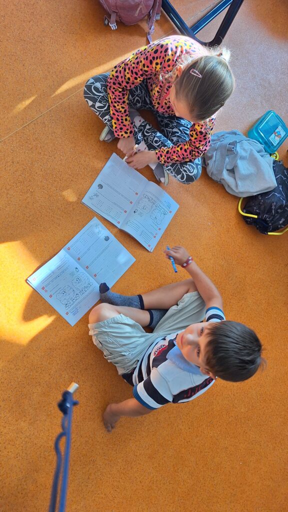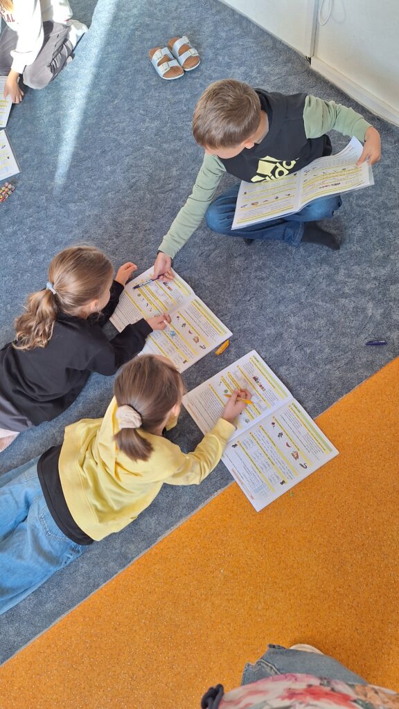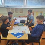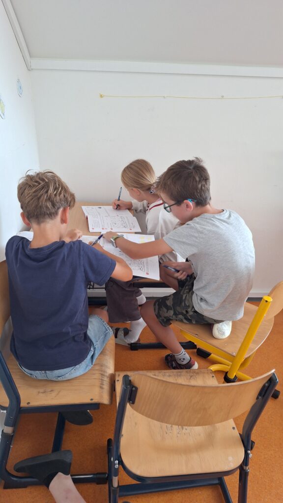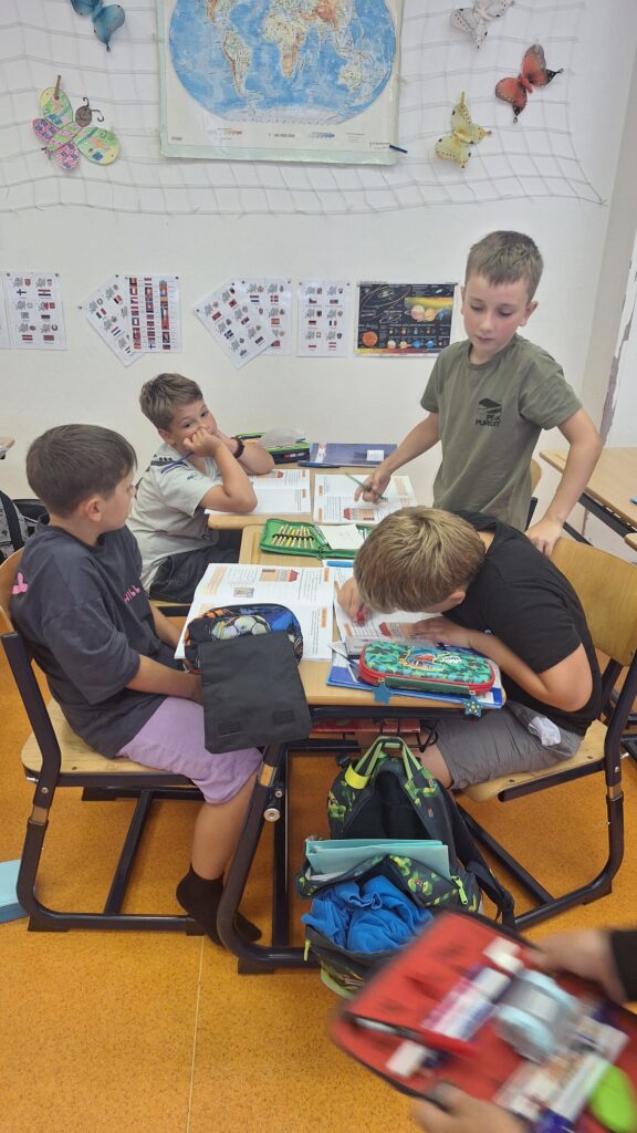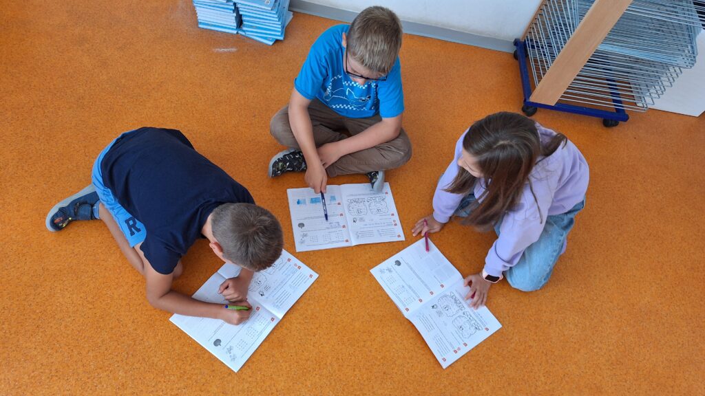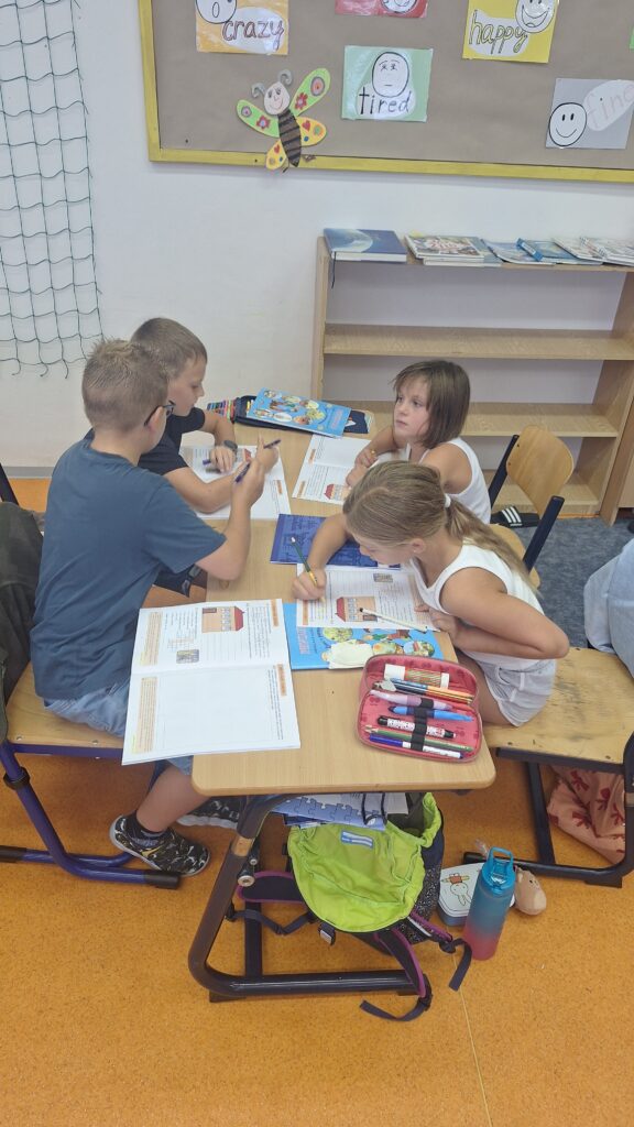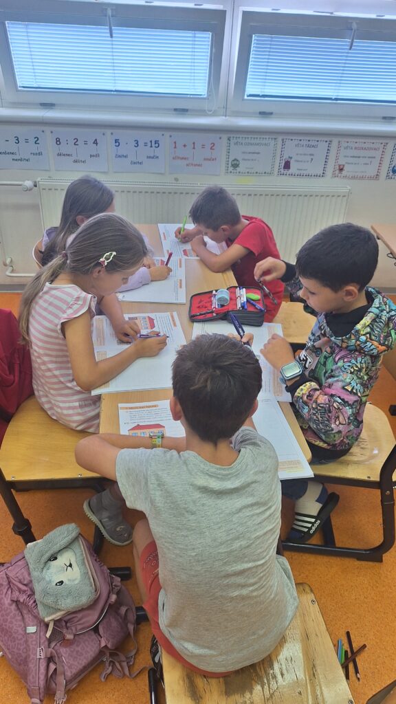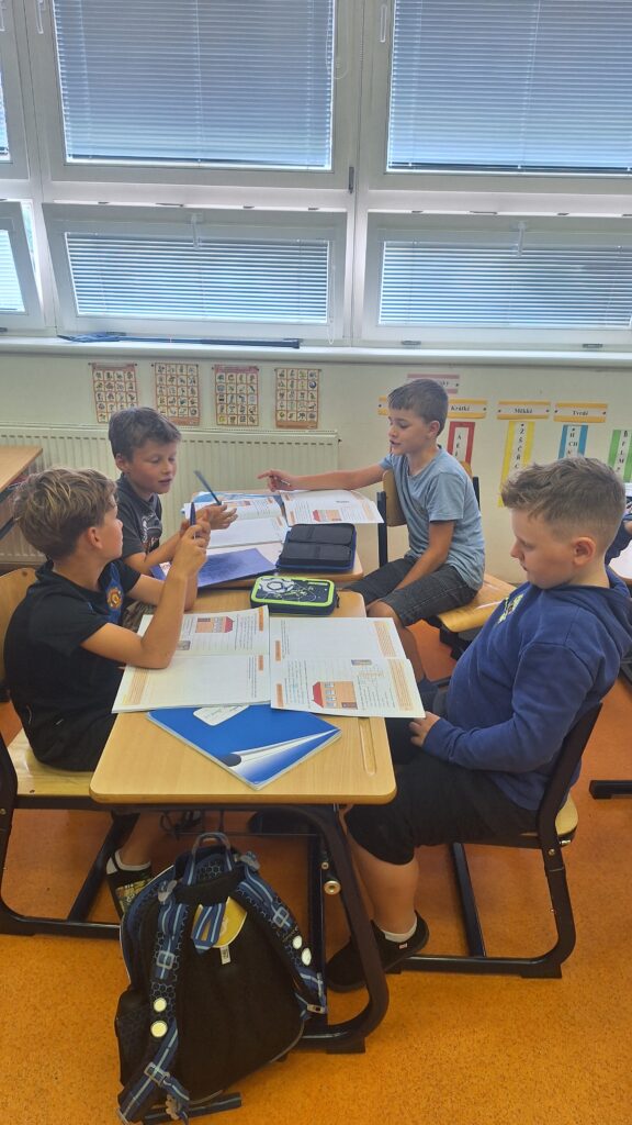 Naši třeťáci se učí spolupracovat ve skupinách při různých úkolech a malých projektech. Tentokrát žáci v hodině prvouky procvičovali orientaci v mapě. Děti pracovaly ve skupinách, kde si navzájem ukazovaly, kde bydlí, a společně na mapě hledaly cestu do školy. Ze skupinové práce mají děti radost i v hodinách matematiky i českého jazyka. Takové učení je pro děti zábavné a posiluje jejich týmového ducha.