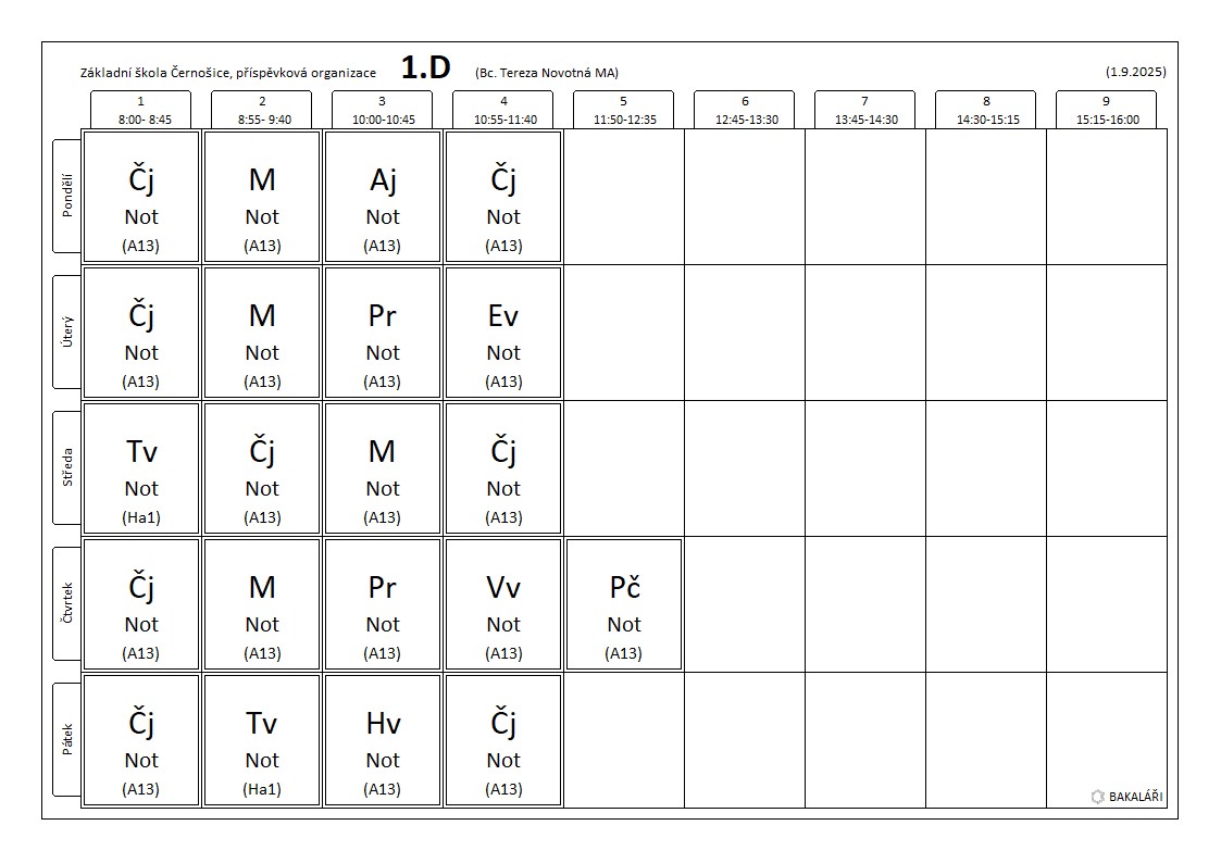 PLÁN UČIVA NA TÝDEN OD 15. – 19. 9. 2025 Třída: 1. D Český jazyk PO – PÁ (čísla stránek a cvičení najdete v Bakalářích) · předčtenářské období zraková a sluchová diferenciace zraková a sluchová paměť sluchová pozornost · uvolňovací cviky · orientace na ploše (vlevo, vpravo, nahoře, dole) · Živá abeceda – Barevný týden, barevné vyučování str. 14-21 Matematika PO – PÁ (čísla stránek a cvičení najdete v Bakalářích) · Počítáme do 5, do 6 sčítání různých objektů, znaménko + stavby z krychlí krokování čtení číslic 1, 2, 3 budování představy odčítání · PS str. 12-17 Anglický jazyk…
