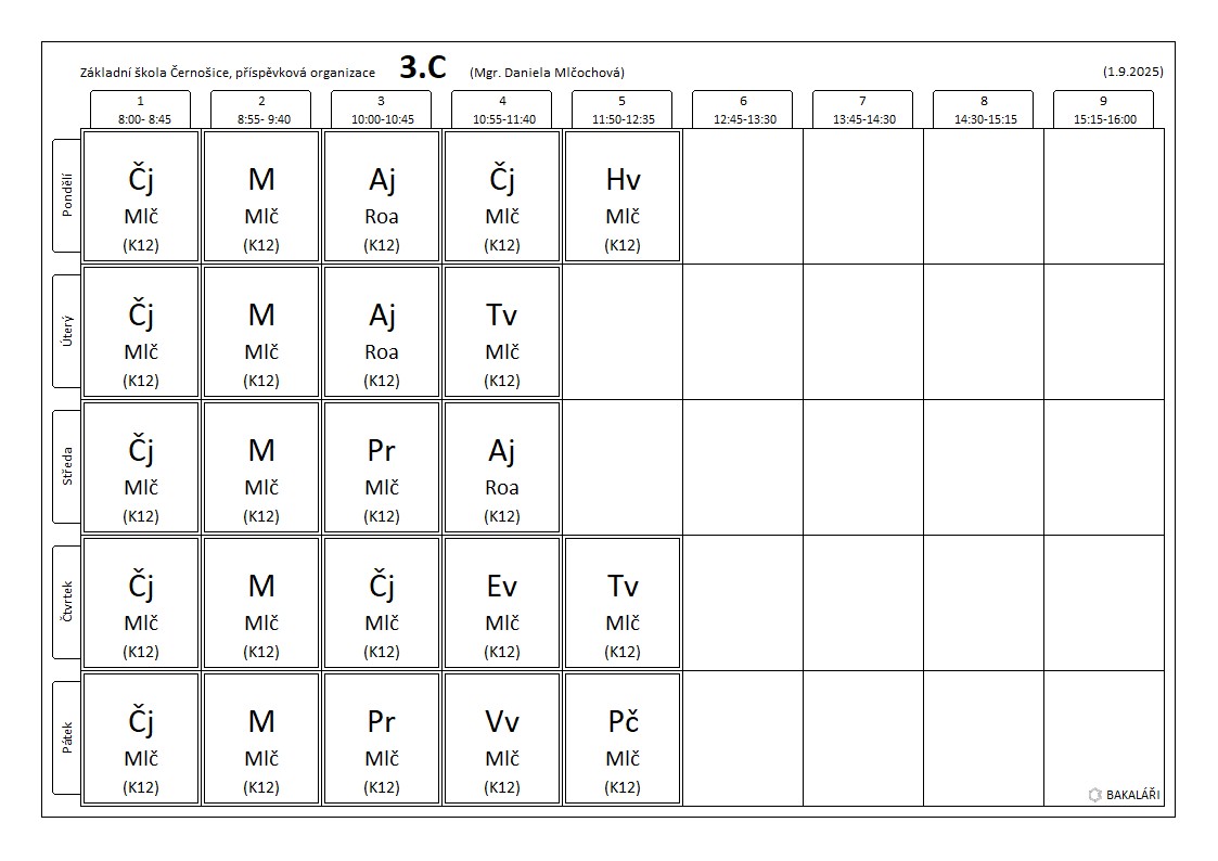 PLÁN UČIVA NA TÝDEN OD 15.-19.9.2025 Třída: 3.C Český jazyk Opakujeme Uč. do s. 14 PS do s. 9 Písanka do s. 4 Matematika Uč. do s. 11 PS do s. 9 Anglický jazyk Po Hra o spolužácích; Opak.: barvy a čísla (nácvik psaní): pracovní učebnice 7-8 Út Opak.: Příkazy a věci ve třídě: pracovní učebnice 9-10 a kartičky St Opak. In my bag (čtení, psaní, rozpoznávání) a příkazy: pracovní učebnice 11-12 *Dobrovolné domácí úkoly: kniha domácí příprava str 1-3 Prvouka Uč. do s. 5 PS do s. 5 Další informace: …