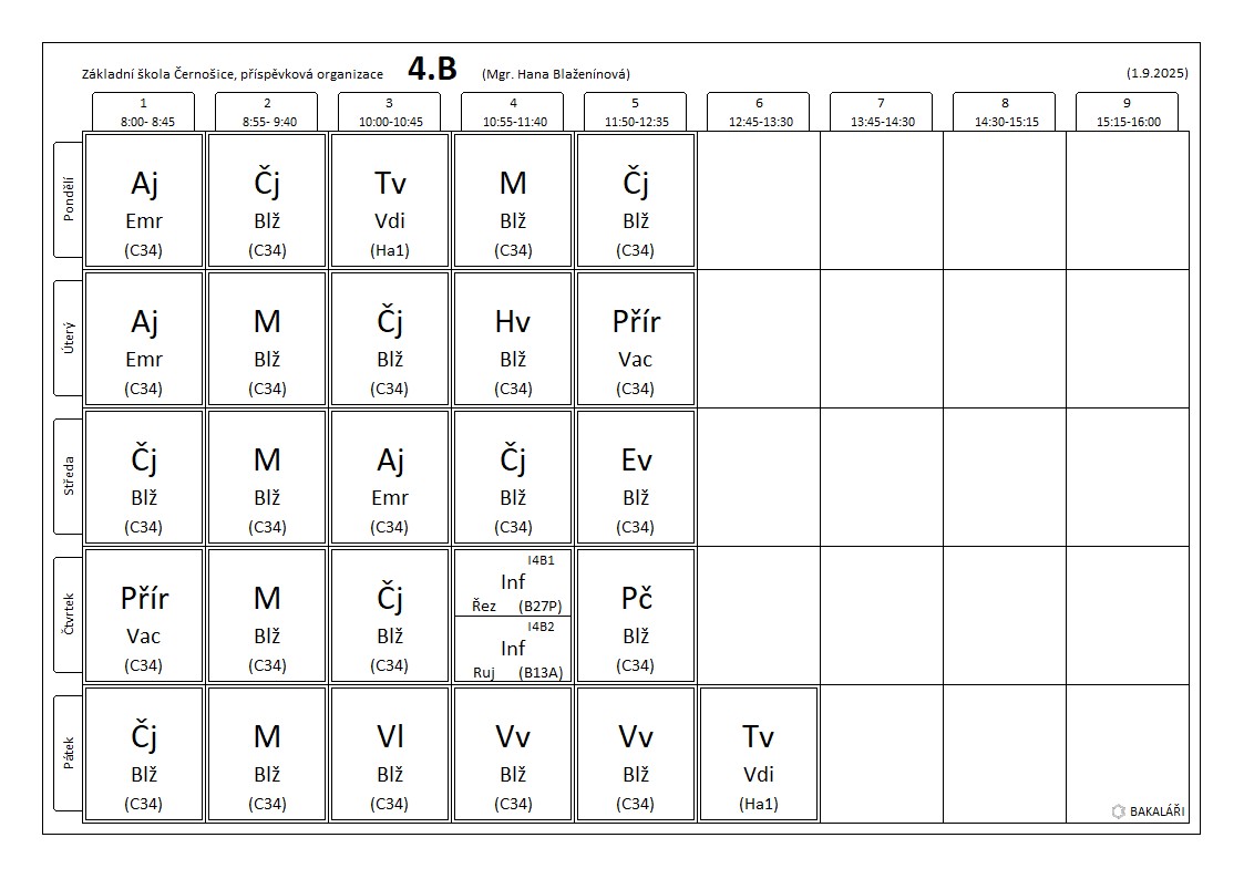 PLÁN UČIVA NA TÝDEN OD 6. – 10. 10. 2025 Třída: 4. B Český jazyk Opakování vyjmenovaných slov Nauka o slově – úterý Stavba slova – kořen, předpona, přípona Předložky a předpony Sloh – pracovní postup Společná četba – Puntíkáři – M. Kratochvíl Čtenářský list do 30.10. Matematika Procvičování násobilky Pamětné sčítání a odčítání trojciferných čísel Písemné násobení – čtvrtek Slovní úlohy Geometrie – Bod, přímka, rovina Anglický jazyk Přírodověda Vlastivěda Pravěk Doba kamenná – test v pátek Doba bronzová Doba železná Práce v pracovním…