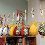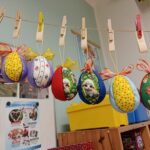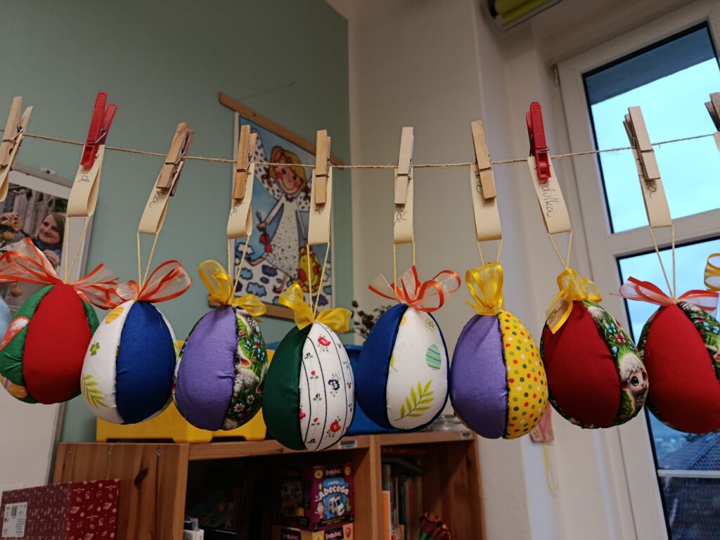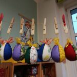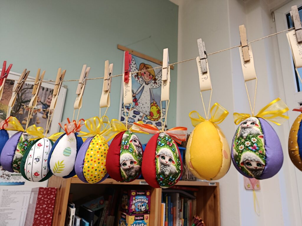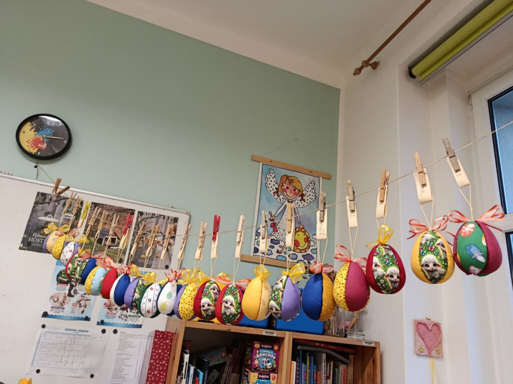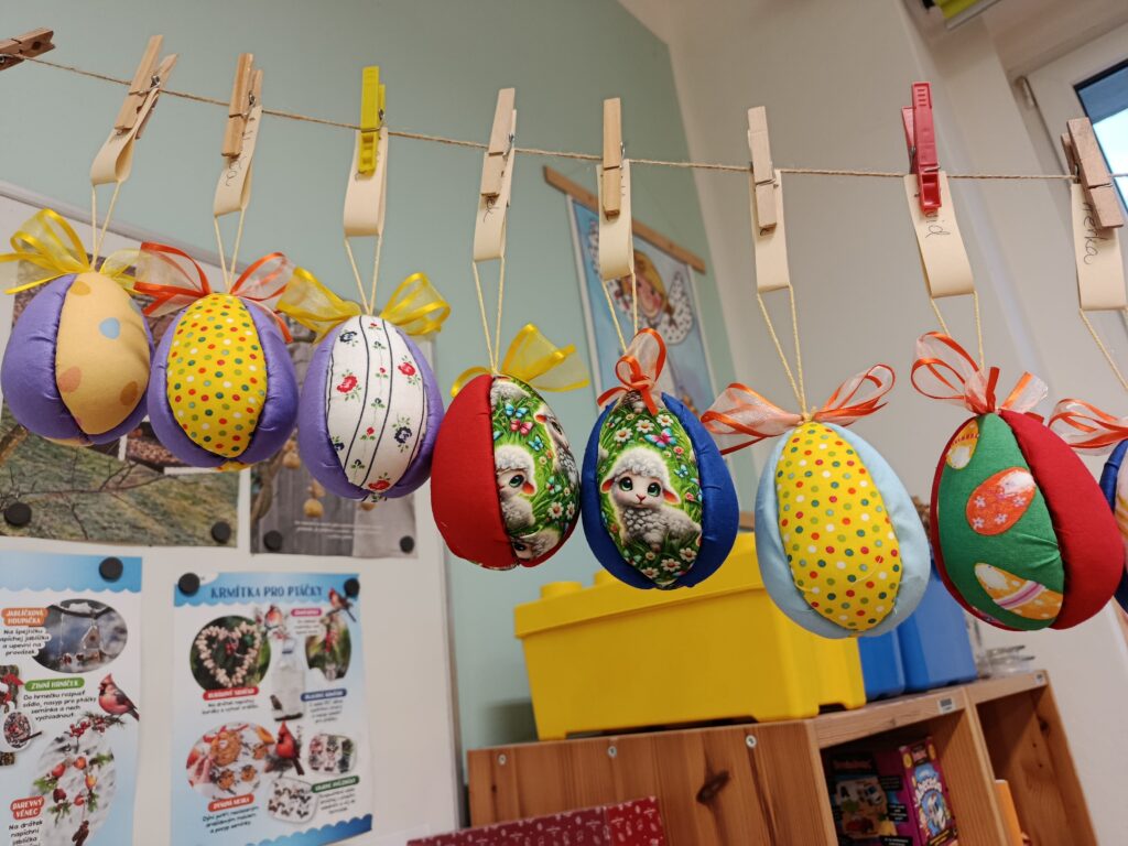 Ráda s dětmi vytvářím nerozbitná ( trvanlivá) vajíčka. I letos práce s polystyrénovými tvary zdobené látkami a mašlí