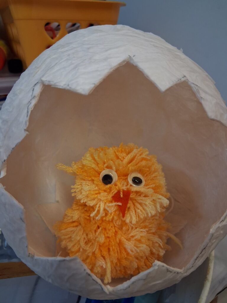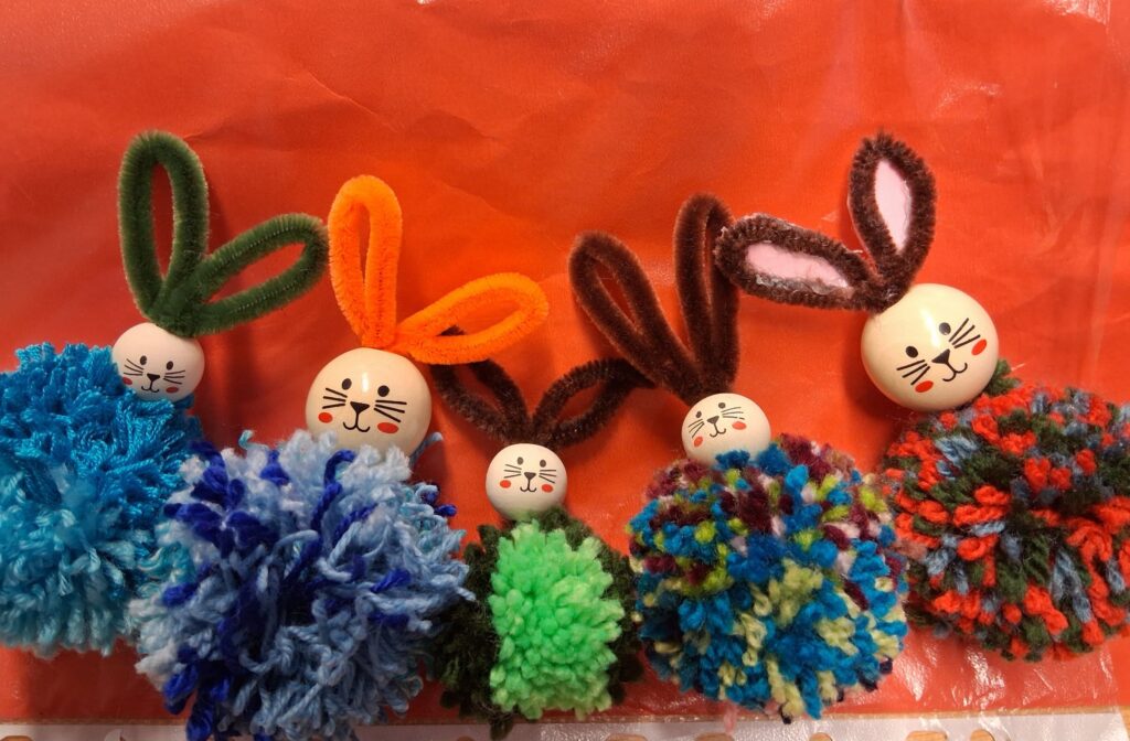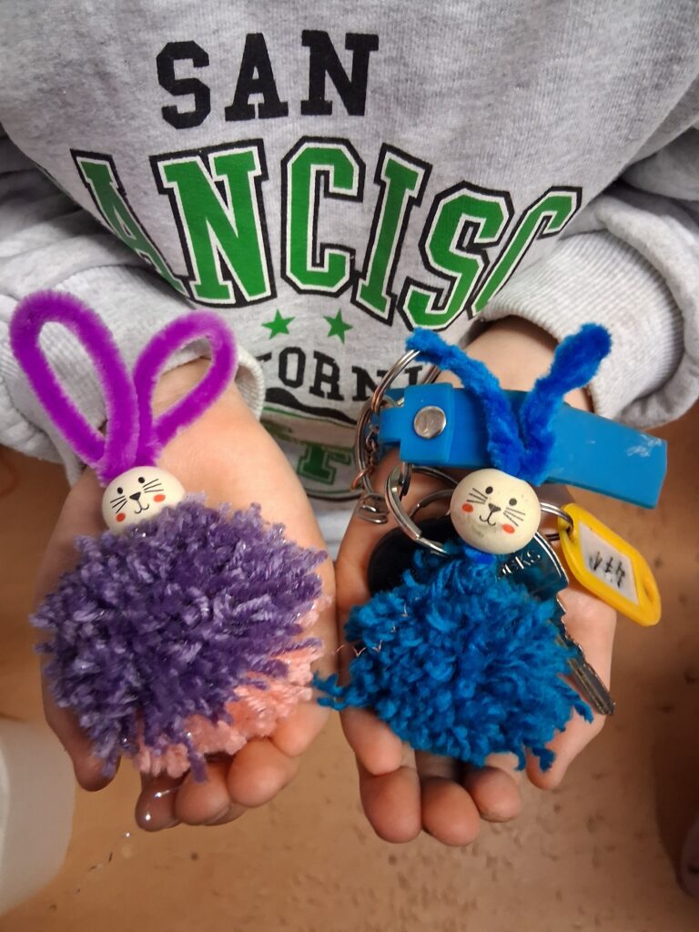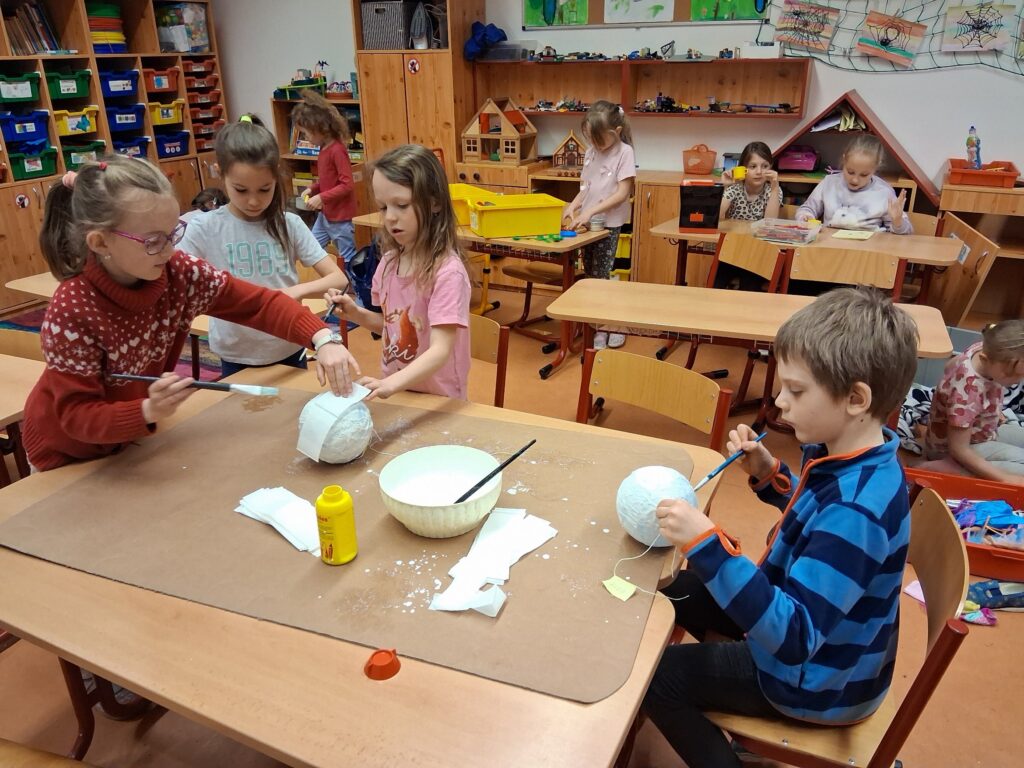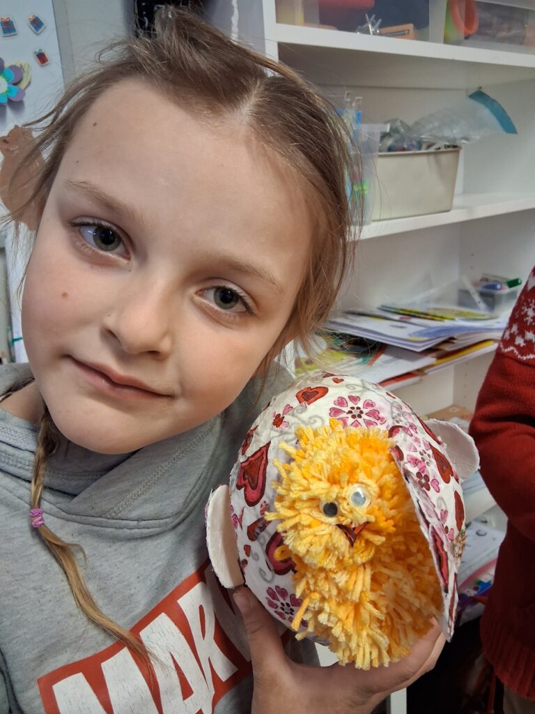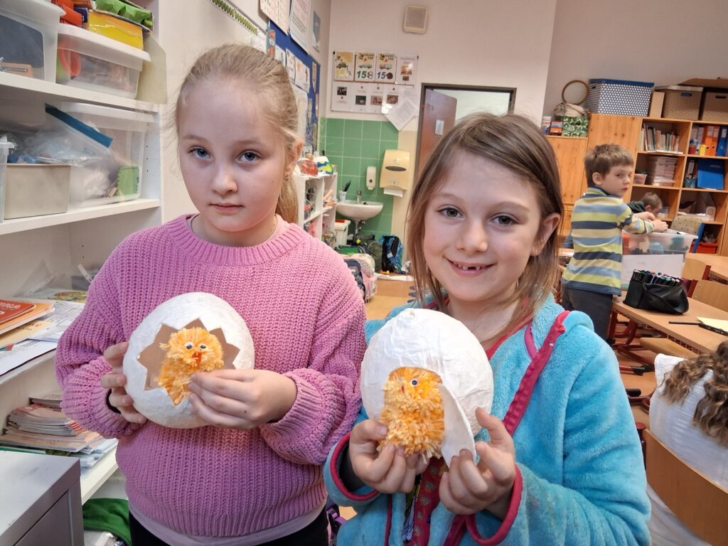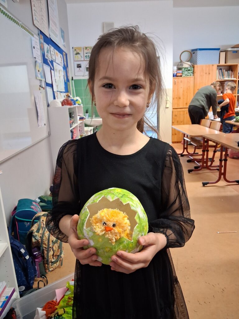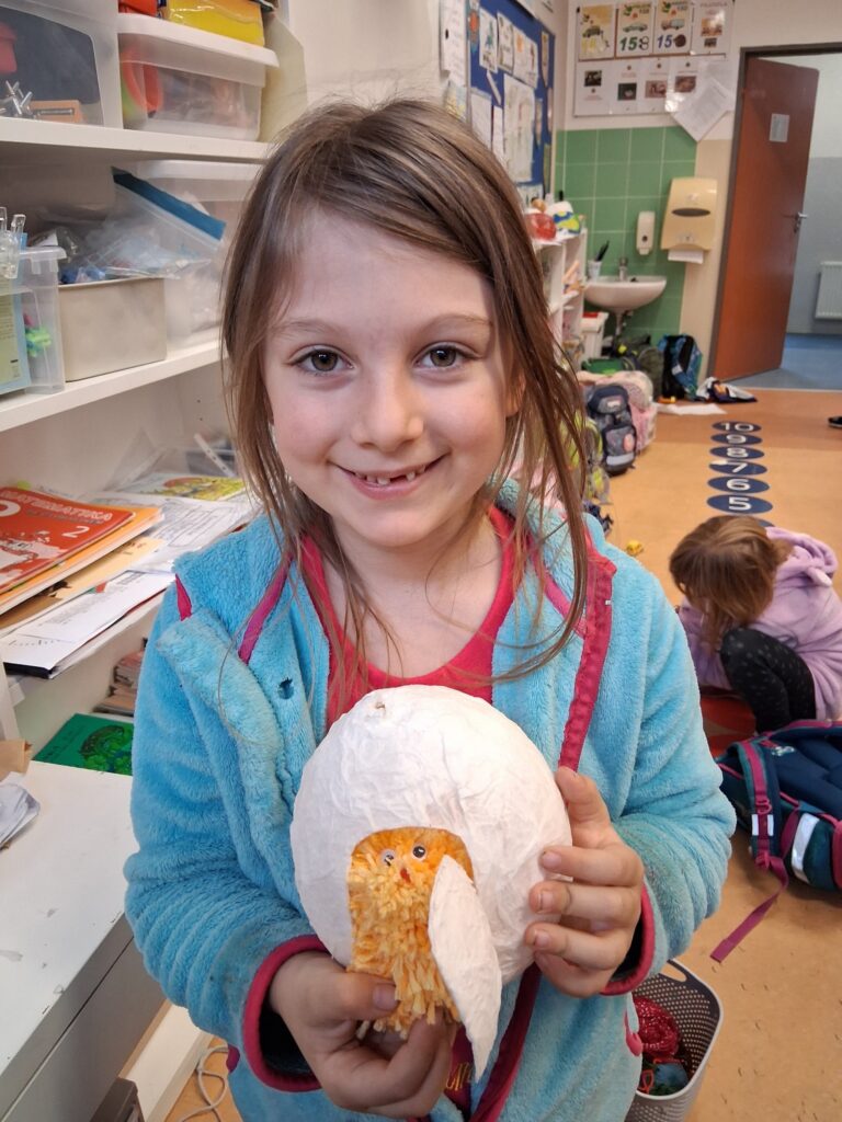Ke konci března jsme se v Medvídcích věnovali velikonočnímu tvoření. Nejprve jsme se patlali v lepidle. Pomocí papírových utěrek, barevných ubrousků a nafouklého balonku jsme vytvořili postupně 15 originálních vajec. Aby nezůstala neobydlená, přišlo na řadu kuře z bambulek a filcu. Bambulkování se u nás opět rozjelo hlavně výrobou roztomilých králíčků Ušáčků. Celkem jsme jich vyrobili rekordních 60 kousků. Aby toho velikonočního tvoření nebylo málo, využili jsme zbytky látek na dekoraci polystyrenového vejce. Letos na Velikonoce držíme krásné prvenství v tvořivosti.