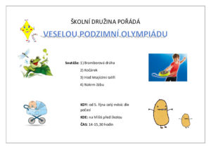 Tento rok během měsíce října naše družina uskuteční tradiční Veselou podzimní olympiádu, které se zúčastní děti ze všech našich oddělení. Pro děti jsme si připravili opět zajímavé soutěže zábavnou formou, při kterých si procvičí svoji tělesnou zdatnost a zručnost.