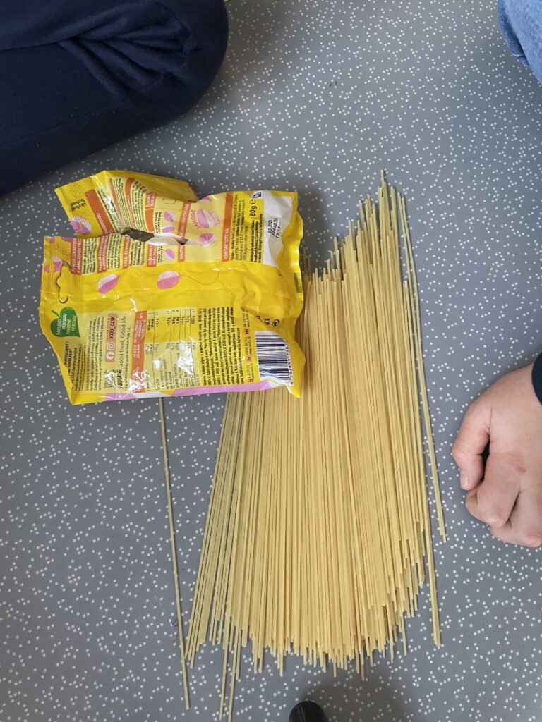Na konci jsme změřili všechny věže a vyhlásili vítěze. Nejvyšší věž měla přes 70 cm – a držela se překvapivě pevně! Tato věž si zaslouží jedno speciální ocenění, a totiž, že kluci, kteří ji stavěli, se nevzdali, když se jim první výtvor po 10 minutách zbortil. Začali znovu a zvládli v polovičním čase vystavět špagetové monstrum… 🙂