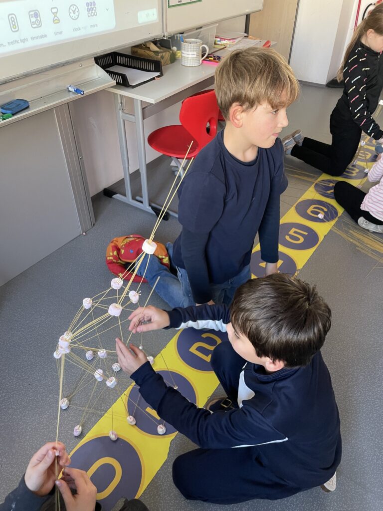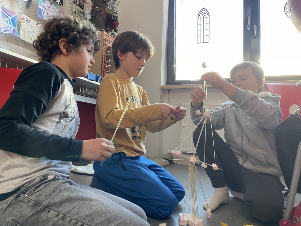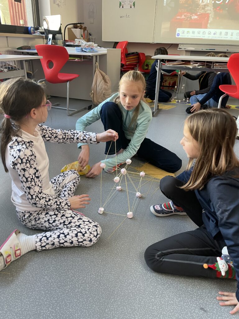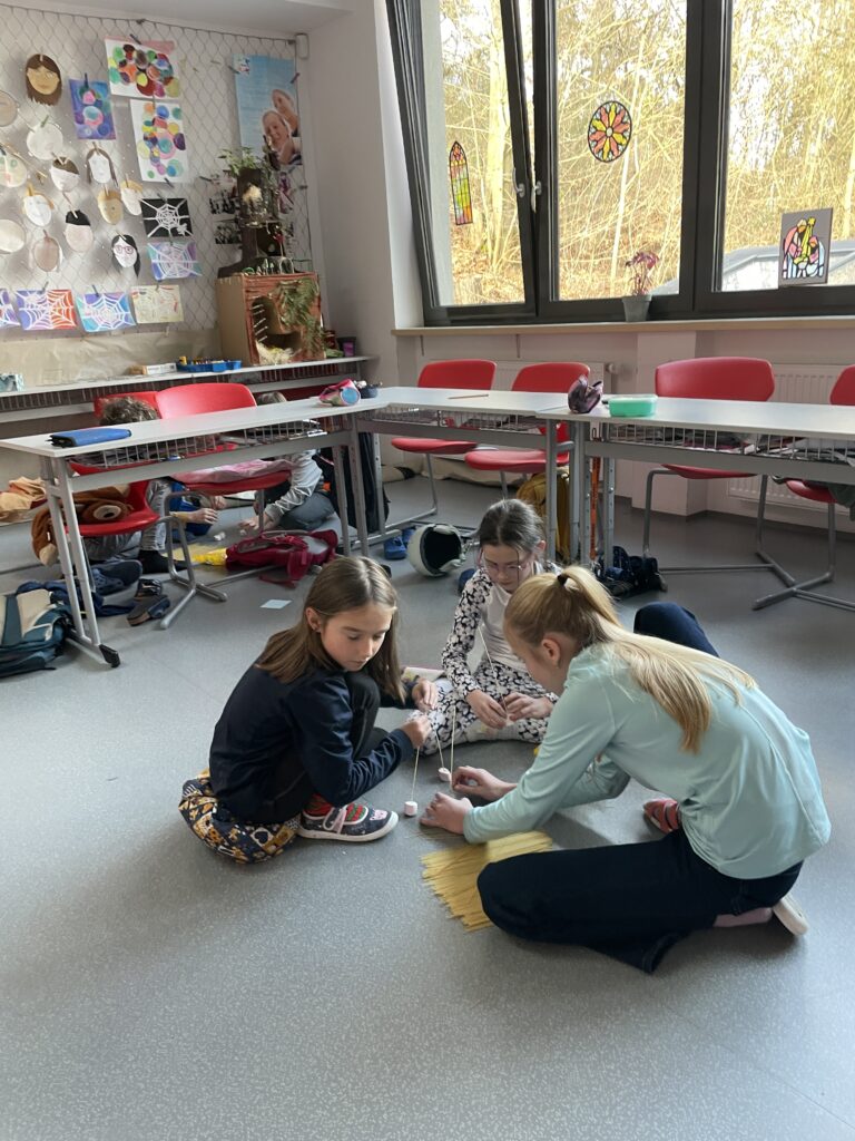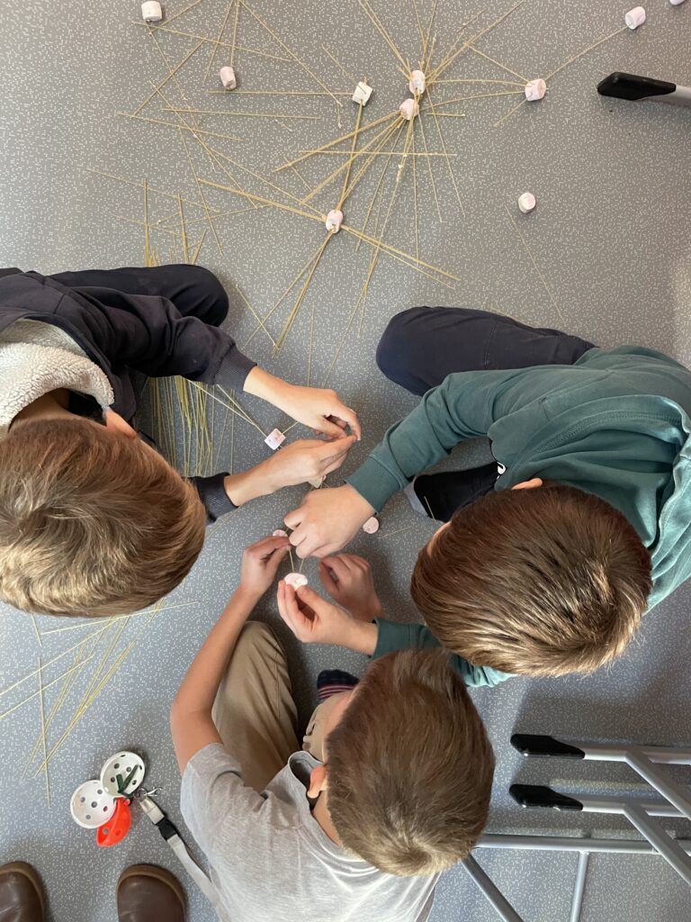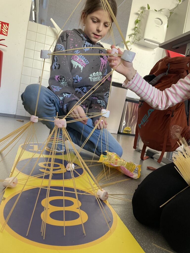 Rozdělili jsme se do menších týmů a každý dostal stejný počet špaget a marshmallownů. Časový limit byl 20 minut. Pravidlem bylo, že po skončení limitu musí být všechny ruce ze stavby pryč a aby věž vydržela samostatně stát po dobu měření výšky. Všichni jsme začali plánovat – některé týmy vsadily na pevnou základnu, jiné na odvážné výškové konstrukce. Během stavby jsme se naučili, že rovnováha a správné rozložení hmotnosti jsou klíčem k úspěchu.