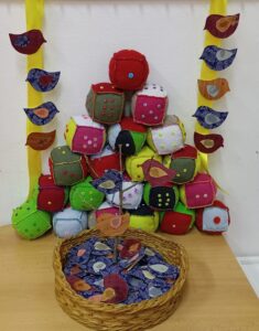 Kromě ptáčků můžete získat od nás také příjemné kostky s rolničkou, které vyráběla paní učitelka.