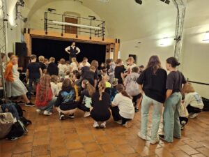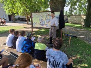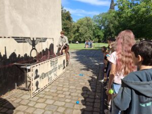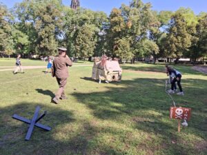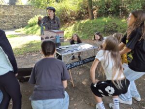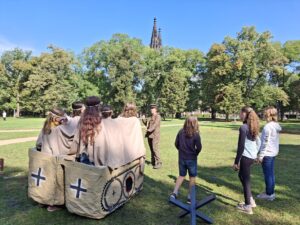 V krásný slunečný zářijový úterní den se naše třída vypravila do Prahy, tentokrát na Vyšehrad. Konala se zde divadelní bojovka festivalu VyšeHrátky pod taktovkou studia Damúza. Letošní téma připomínalo výročí konce druhé světové války. Žáci prošli devět stanovišť, na kterých si mohli krátce zažít zásadní aspekty života v Protektorátu Čechy a Morava, např. jaké to je být občanem druhé kategorie, účastnit se domácího i zahraničního odboje, být odkázán na přídělový systém, unikat při bombovém útoku do krytu, luštit zašifrovanou zprávu, obnovovat vybombardované části města apod.