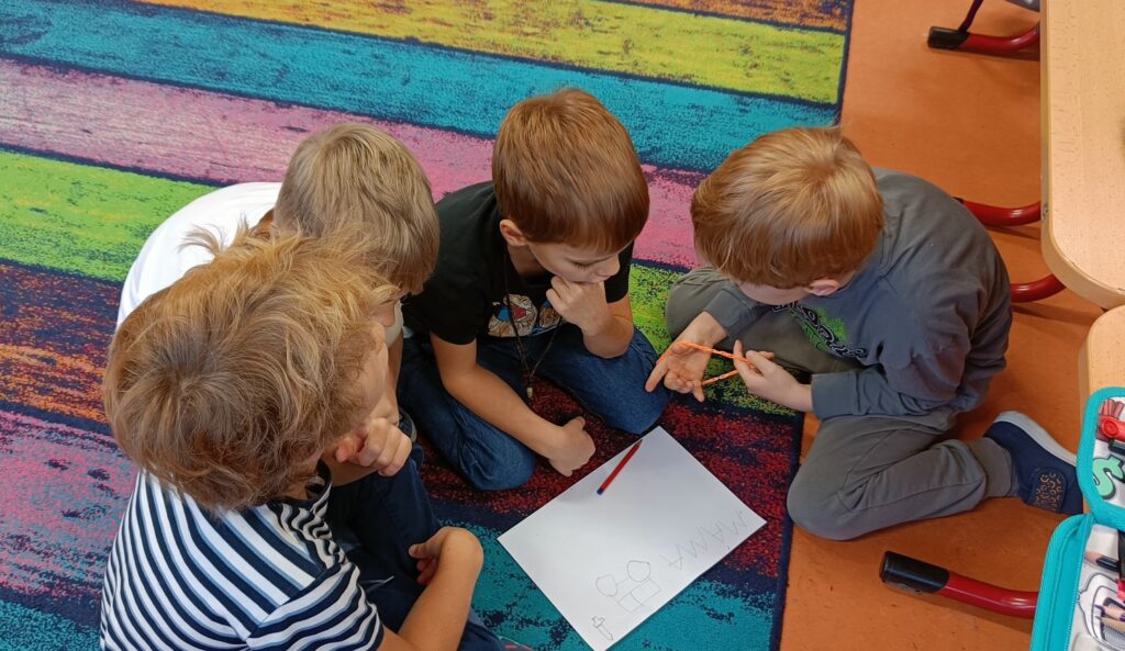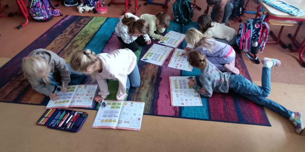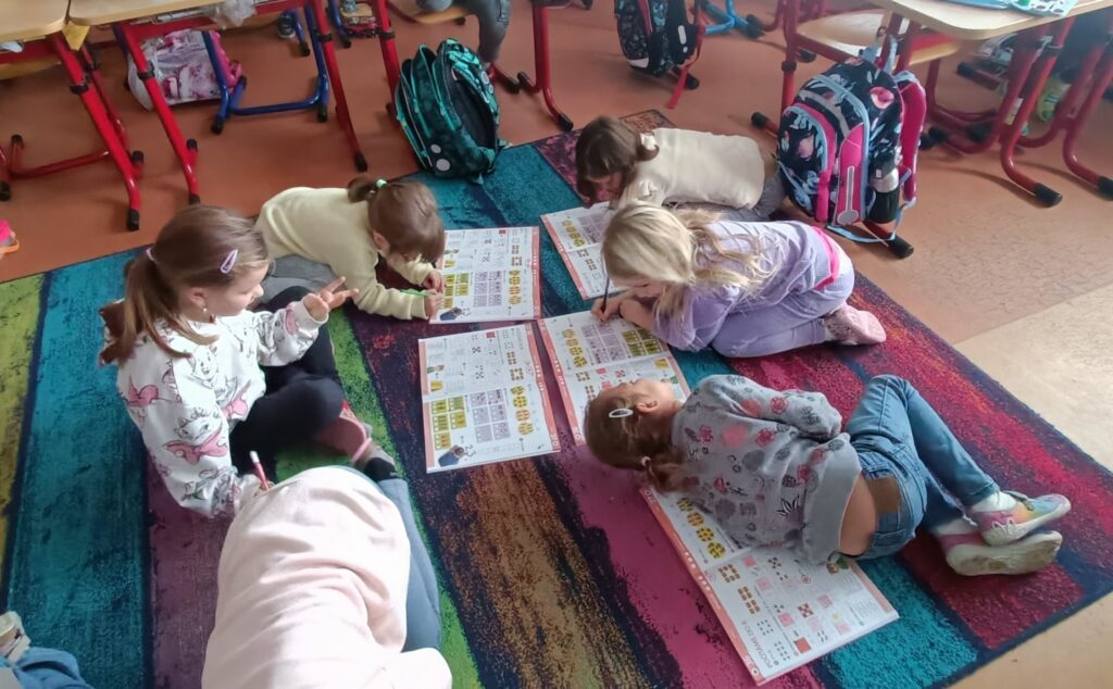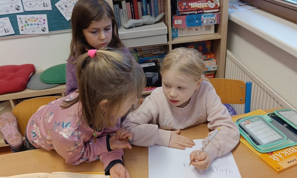 V rámci výuky se snažím zařadit zábavné prvky, abychom neseděli jenom v lavicích. Například jsme si hráli na rodinu a vztahy v rodině, dnes jsme měli běhací matematiku, kdy mají děti na chodbě nalepené příklady + obrázky. Musí si zapamatovat obrázek i příklad a pak běží zaznamenat příklad, který si zapamatovali, ke správnému obrázku a následně ho vypočítají. Běhání je spojené s Bobříkem mlčení :-). Děti se proběhnou, vypočítají 10 příkladů a posílí svou paměť. Myslím, že to všechny bavilo. 🙂