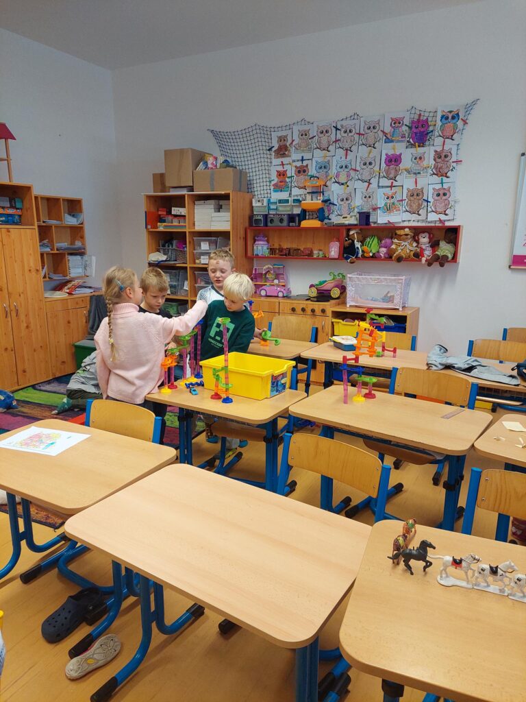 V měsíci říjnu jsme se podle vzdělávacího plánu věnovali první dovednosti – naslouchání. Program je postavený na společných aktivitách a hrách, které by děti měly především bavit. Pro tuto dovednost jsme si přečetli části „Kočičí pohádky“. Děti při poslouchání příběhu zaměřily svoji pozornost na to, jak si pes s kočkou v příběhu naslouchají a jaké si dávají navzájem pokyny. Po přečtení jsme s dětmi diskutovali o tom, co jim toto čtení přineslo a co si zapamatovaly. Následně jsme si ještě v dalších hodinách přečetli knížku „Lví král“, která je hlavně o lvech, ale i o jiných zvířátkách. Děti dovedly v jednoduchých větách jasně a přehledně vyjádřit své myšlenky a následně je sdělit ostatním Sovičkám.