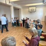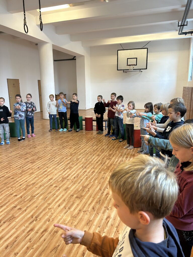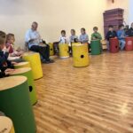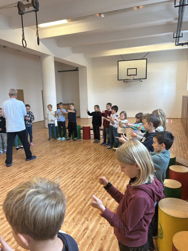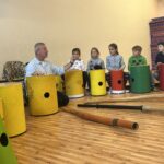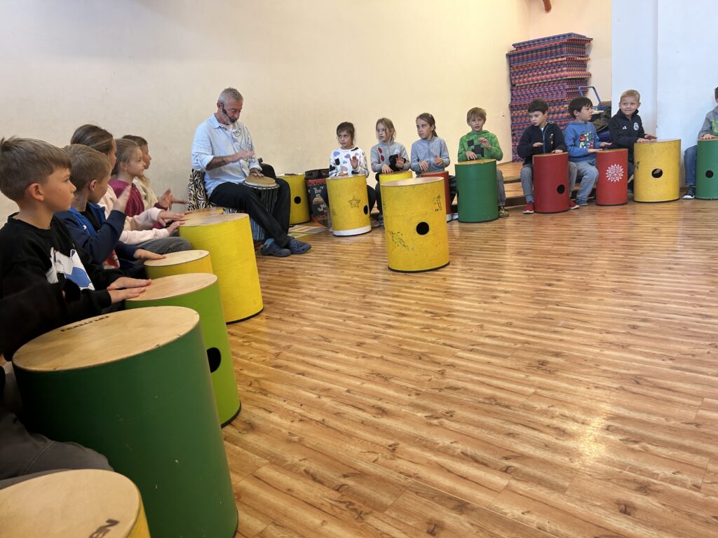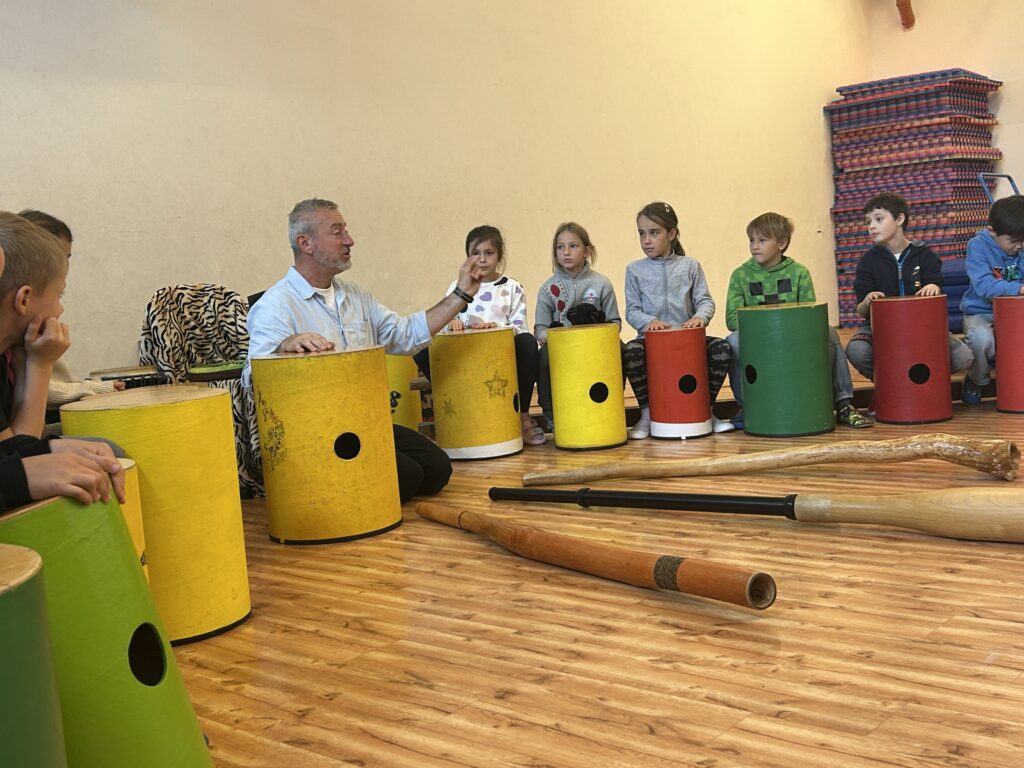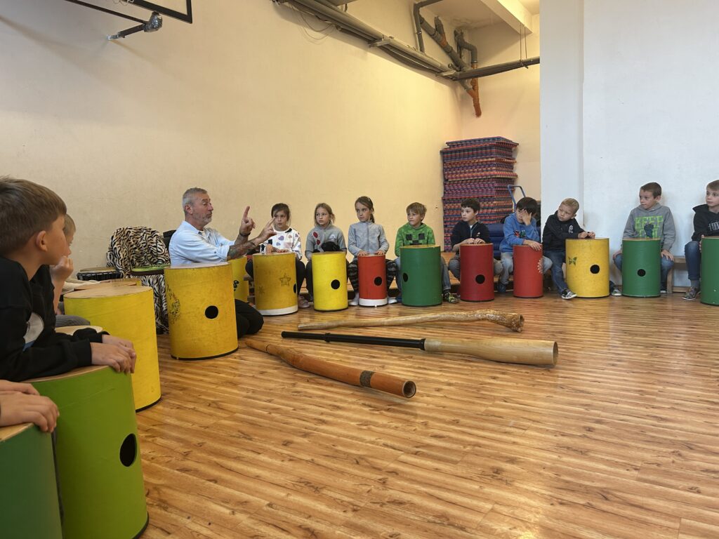 Září zakončila hudební návštěva – bubeník, který děti provedl rytmy z různých koutů světa. Společně si zabubnovaly a na závěr si poslechly hru na exotický hudební nástroj Didžeridu, což byl pro všechny silný zážitek.