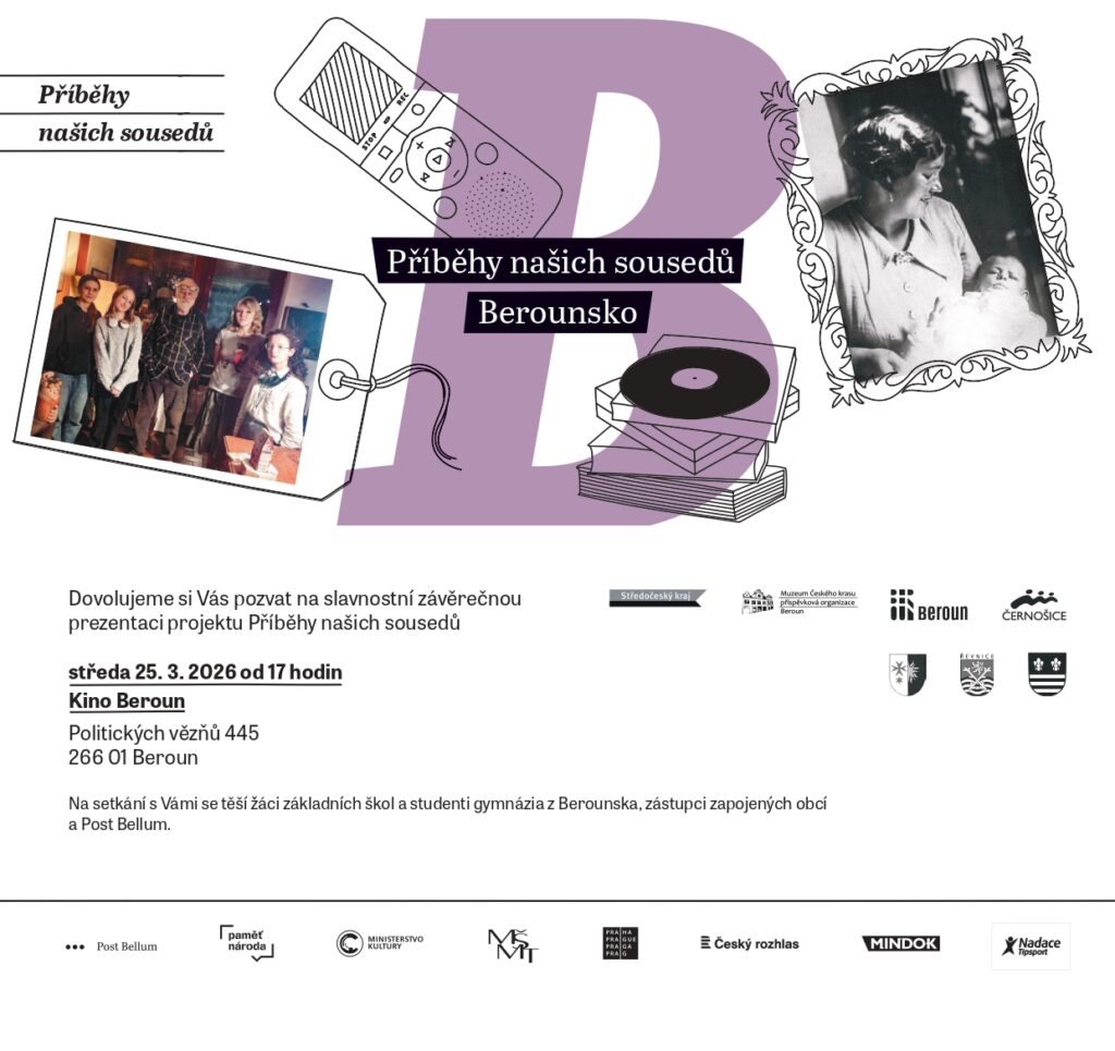 Srdečně zveme širokou veřejnost na závěrečnou prezentaci projektu Příběhy našich sousedů, která se uskuteční ve středu 25. března 2026 od 17.00 v berounském kině. Přijďte si poslechnout příběh naší pamětnice paní Jany Paďoukové i dalších osobností z Poberouní.